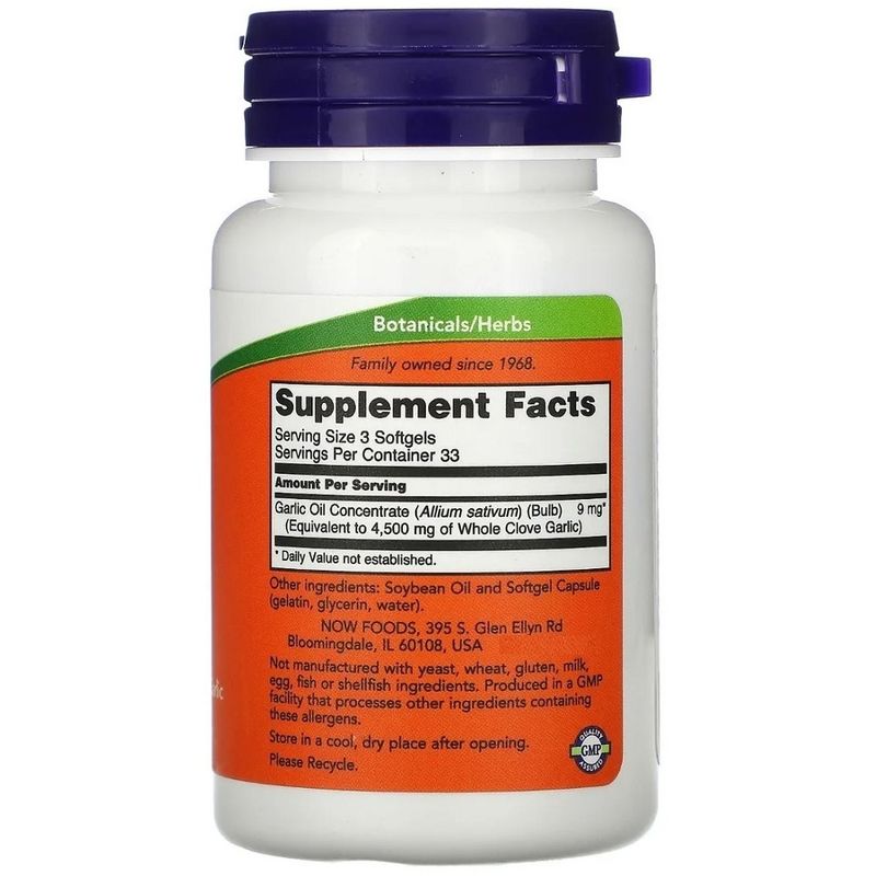 Óleo de Alho Now Foods 100 Cápsulas Importado Possui vitaminas do complexo B (B1, B2, B6), vitamina C, selênio, cálcio, cobre, potássio e ferro. O Óleo de Alho da NOW é extraído e concentrado a partir do bulbo do alho (Allium sativum). Ele equivale a um dente de alho inteiro, sem adição de excipientes. O alho possui compostos sulfúricos, aminoácidos e oligoelementos de ocorrência natural. Uso Sugerido Tome três cápsulas gelatinosas por dia, preferencialmente com algum alimento. Outros Ingredientes Óleo de soja e cápsula de gelatina (gelatina, glicerina, água). Não fabricado com ingredientes de fermento, trigo, glúten, leite, ovo, peixe ou marisco. Produzido em uma instalação GMP que processa outros ingredientes que contenham esses alérgenos. Por se tratar de um produto concentrado, ele contém um pequeno odor, a recomendação é não consumir com o estômago vazio. Produto autorizado para comercialização em todo o território nacional através da RDC 240 de 26 de julho de 2018.