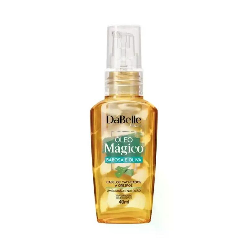 Óleo de tratamento para cabelos crespos e cacheados. Óleo Mágico DaBelle Hair Oliva e Babosa é perfeito para umectar e nutrir profundamente os fios. Também possui filtro UV e proteção térmica. Óleo Mágico DaBelle Hair Oliva e Babosa é super versátil porque pode ser utilizando tanto para tratar quanto finalizar os fios. Ele ajuda a proteger os fios do calor e do sol, condiciona, mantêm o penteado no lugar, define os cachos e adicionar aquele brilho extra. Tem tamanho perfeito pra levar na bolsa e válvula que facilita a dosagem e a aplicação. Use e abuse sempre que precisar! Ação Óleos de Babosa e Oliva: dose extra de nutrição, definição poderosa e fortalecimento dos fios. Como Usar DaBelle Hair Óleo Mágico Oliva e Babosa Conselho de Aplicação Aplique de 2 a 4 pumps – ou a quantidade que você preferir – na palma das mãos e espalhe bem sobre comprimento e pontas. Você pode enriquecer sua Máscara com alguns pumps para umectação ou combinar com a Gelatina Líquida e Creme para Pentear DaBelle Hair para hidratar e definir os cachos nos rituais que você preferir. Para fazer a fitagem: aplique sobre os fios úmidos e penteie mecha a mecha com as mãos, esticando cada seção como se fossem fitas.