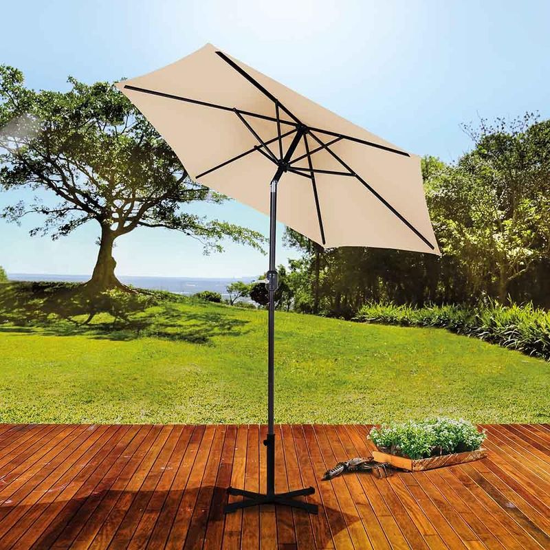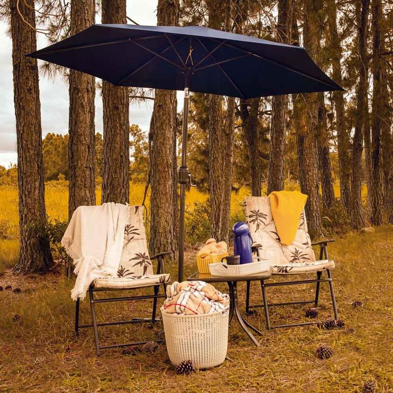 Garanta a sua sombra refrescante nos dias ensolarados com o Ombrelone com Manivela Alumínio 2,4m! Sua estrutura em alumínio garante maior durabilidade e o torna ideal para qualquer ambiente externo, seja no seu jardim, ao lado da piscina ou em sua varanda. Seu tecido em poliéster possui FPS 35 e está disponível em duas opções de cores: bege e azul. Não acompanha a base, mas possui haste com Ø 38mm articulável, que permite ajuste para se adequar ao sol, e manivela, que torna muito prático na hora de abrir ou fechar o ombrelone. Adicione elegância onde você quiser com o Ombrelone com Manivela Alumínio 2,4m!Importante: O uso do Ombrelone não dispensa o uso de Protetor Solar. Descrição do produto Marca: Mor Life Materia: Alumínio Haste: Ø38mm Altura: 2,18 m Largura: 2,40 m Comprimento: 2,40 m Peso: 2,80 kg Imagens meramente ilustrativas, todos os itens que ambientam o produto não estão inclusos.