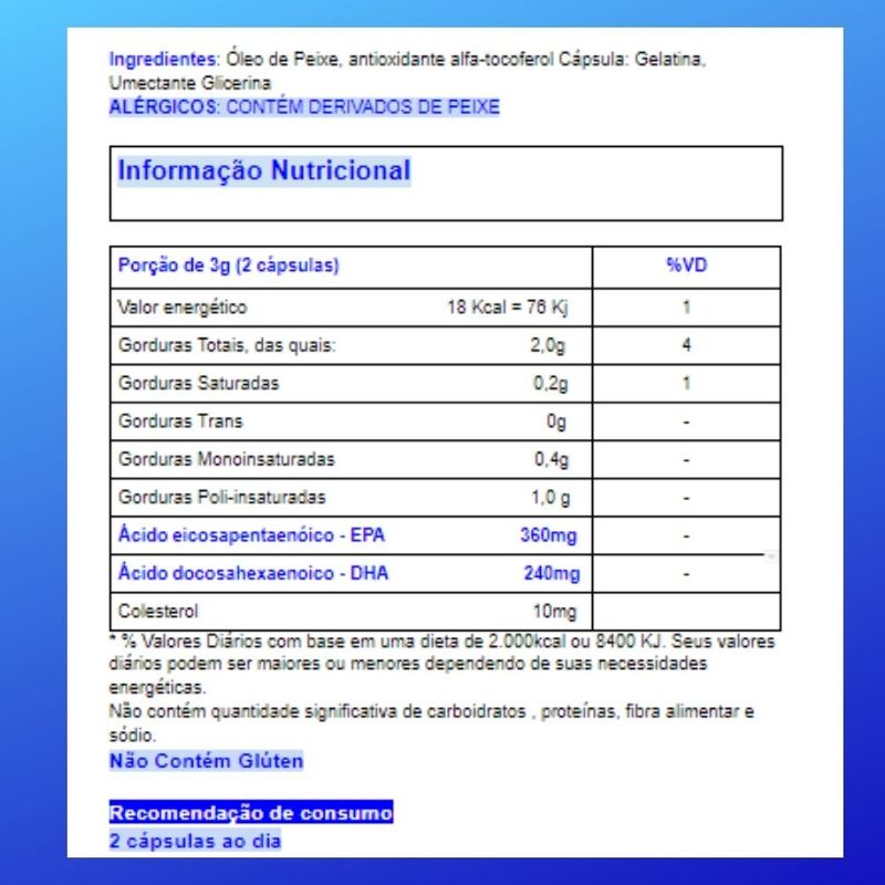 Quantidade: 3 Frascos com 60 cápsulas O Óleo de Peixe fornece para a dieta alimentar Ômega 3 (EPA e DHA). “O consumo de ácidos graxos ômega 3 auxilia na manutenção de níveis saudáveis de triglicerídeos, desde que associado a uma alimentação equilibrada e hábitos de vida saudáveis”. “Pessoas que apresentem doenças ou alterações fisiológicas, mulheres grávidas ou amamentando (nutrizes) deverão consultar o médico antes de usar o produto” ALÉRGICOS: CONTÉM DERIVADO DE PEIXE. Registro MS: 6.2613.0016 Sobre a CHAMEL - Controle de Qualidade: A CHAMEL conta com laboratórios equipados para o Controle de Qualidade de todos os insumos recebidos e utilizados pelo setor industrial.