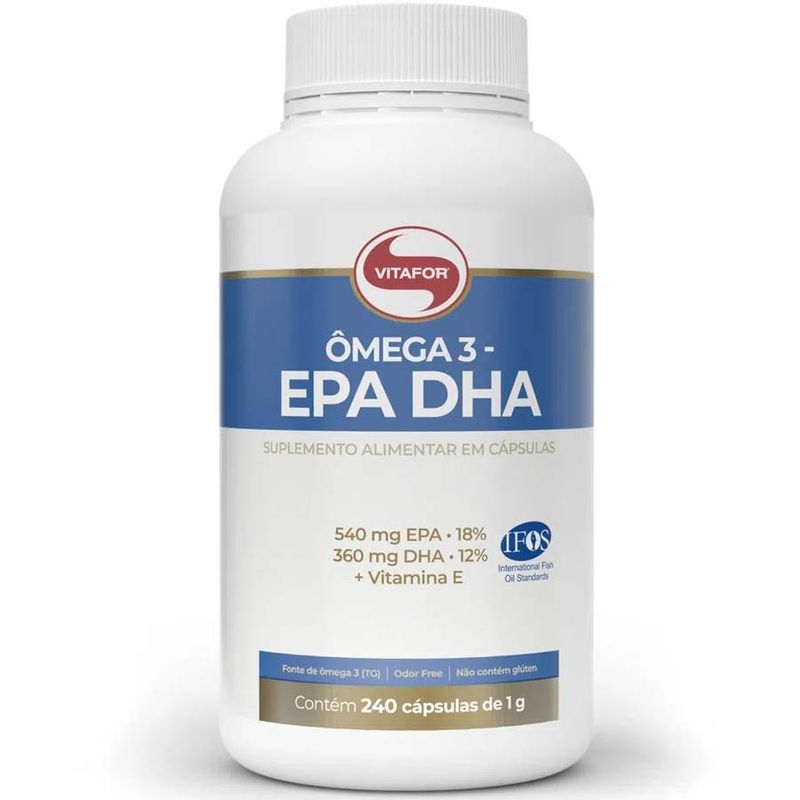 Omega 3 Epa Dha 240 Caps – Vitafor 540mg epa 360mg dha Omega 3 epa dha Vitafor é um suplemento a base de óleo de peixe extraído de águas frias e profundas das regiões polares, sendo rico em ácidos graxos de cadeia longa, da série omega 3. Seus constituintes são: o ácido eicosapentaenóico (epa) e o ácido docosahexaenóico (dha), sendo considerados ácidos graxos essenciais. Também possui vitamina E em sua composição. A matéria-prima é livre de metais pesados, garantindo a pureza do óleo através da certificação ifos (InternationalFishOil Standards) O epa é importante por sua ação anti-inflamatória, pois atua na produção de substâncias anti-inflamatórias chamadas prostaglandinas E3. O epa pode apresentar benefícios para a saúde cardiovascular e a circulação já que além de ser anti-inflamatório, também pode impedir que as plaquetas se unam formando trombos (coágulos) que podem causar trombose e derrame cerebral (avc). Além disso, o epa pode ser interessante para pessoas que apresentam sintomas ou doenças de caráter inflamatório, como celulite, obesidade e artrite reumatoide. O dha é considerado um ótimo alimento para o cérebro e memória, já que grande parte do cérebro é composto por gorduras. Em relação aos benefícios, o dha contém propriedade antioxidante e está envolvido com diversos processos cognitivos, além da correta sinalização entre os neuronios. Há estudos que afirmam que o dha pode impedir a formação de substâncias deletérias para o cérebro e aumentar a produção de substâncias anti-inflamatórias e neuroprotetoras, tendo efeito protetor contra doenças neurodegenerativas como Alzheimer e Parkinson. O dha também tem papel importante no desenvolvimento fetal, além de fazer parte da retina dos olhos. Alegação de propriedade funcional aprovada: O consumo de ácidos graxos omega 3 auxilia na manutenção de níveis saudáveis de triglicerídeos, desde que associado a uma alimentação equilibrada e hábitos de vida saudáveis. Ômega 3 rico em epa e dha; Com Vitamina E em sua composição. Diferenciais: Extraído de águas frias e profundas das regiões polares; Com certificação ifos – InternationalFishOil Standards Program, que garante a isenção de metais pesados e pureza de matéria-prima. Ingredientes: óleo de peixe (omega 3), d-alfa tocoferol acetato (vitamina e). Composição da cápsula: gelatina, água purificada e umectante glicerina. Não contém glúten. Sugestão de uso: Ingerir 1 cápsula, 3 vezes ao dia, preferencialmente 30 minutos antes das principais refeições.
