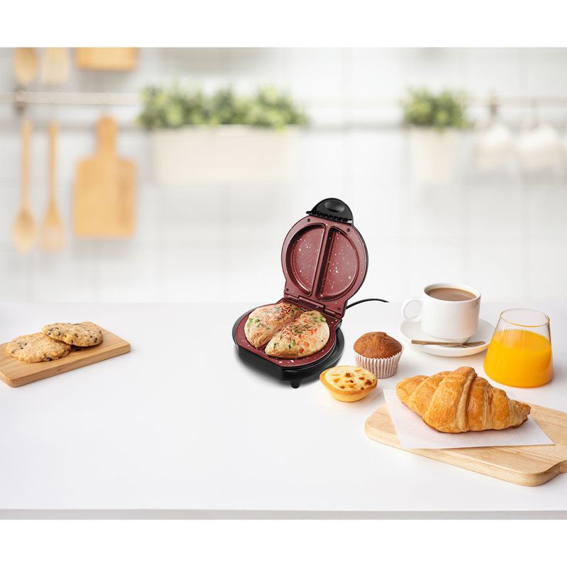 A Omeleteira Britânia BOM02P Antiaderente Redstone 750W vai garantir mais praticidade e rapidez na cozinha. Com capacidade para preparar 2 omeletes por ciclo, proporciona muito mais agilidade no preparo das suas refeições. Seus 750W garantem um aquecimento rápido e uniforme, tornando o processo ainda mais eficiente. Graças ao revestimento Redstone, os alimentos não grudam na chapa, facilitando bastante a limpeza após o uso. A luz indicadora de funcionamento da Omeleteira adiciona um elemento de segurança, indicando claramente quando o produto está em operação. Além disso, a base antiderrapante garante estabilidade durante o uso, evitando acidentes na bancada da cozinha. E não é só omelete que você pode preparar! Com essa Omeleteira Britânia é possível fazer crepiocas, panquecas, pizzas, muffins e muito mais, expandindo suas opções e trazendo ainda mais variedade para as suas refeições. Com a Omeleteira Britânia, a praticidade e o sabor estão garantidos. • Faz 2 omeletes por vez • Rápida e prática • Placas de aquecimento em formato canoa • Placas com revestimento antiaderente Redstone • Base antiderrapante • Luz indicadora de funcionamento