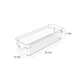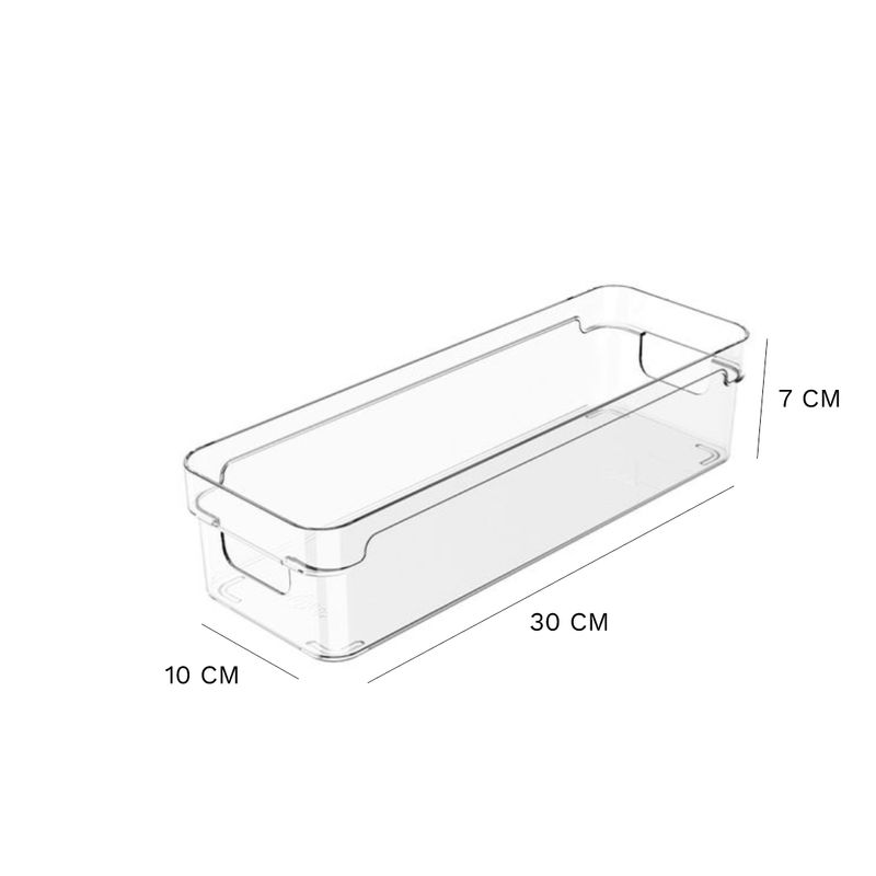 Organizador de Armários Clear Ou 30 x 10 x 7 cm Detalhes do Produto: O Organizador de Armários Clear é o novo padrão de transparência na organização. Seu design foi pensado para permitir diversas composições em diferentes tipos de armários ou gavetões e proporcionar máximo aproveitamento de espaço nos ambientes. Produzido em material resistente, o organizador possui alças confortáveis que facilitam na hora do transporte. Na despensa ou na cozinha, no quarto ou na lavanderia, a Linha Clear é indispensável para auxiliar você na organização da sua casa. Cuidados: Este produto é BPA Free. Não deve ser levado ao freezer, lava-louças e micro-ondas. Sugere-se higienizar o mesmo com sabão neutro e esponja macia, evitando produtos abrasivos no processo de limpeza. Material: Poliestireno (PS) Medidas: 30 cm comprimento x 10 cm largura x 7 cm altura Itens inclusos: 1 unidade do Organizador de Armários Clear 30 x 10 x 7 cm Garantia do fornecedor: 3 meses