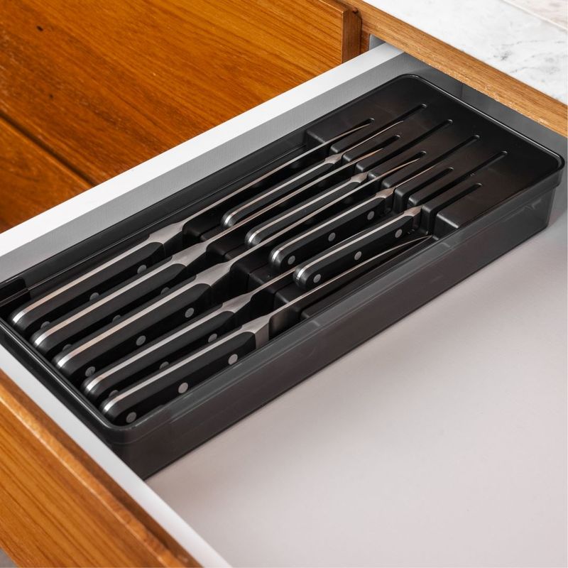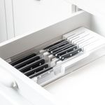 Organizador de Facas Clear Ou 37,5 x 15 x 5,6 cm Detalhes do Produto: A Linha Clear é a união entre transparência e organização que independente do ambiente, promove um design perfeito para organizar e aumentar o espaço das suas gavetas. O Organizador de Facas foi pensado para permitir diversas composições e proporcionar máximo aproveitamento de espaço nas gavetas, por isso, comporta no total 9 facas, sendo 5 facas grandes e 4 facas pequenas, além de divisórias que preservam o fio das facas. Cuidados: Este produto é BPA Free. Não deve ser levado ao freezer, lava-louças e micro-ondas. Sugere-se higienizar o mesmo com sabão neutro e esponja macia, evitando produtos abrasivos no processo de limpeza. Material: Polipropileno (PP) e Poliestireno (PS) Medidas: 37,5 m comprimento x 15 cm largura x 5,6 cm altura Itens inclusos: 1 unidade do Organizador de Facas Clear 37,5 x 15 x 5,6 cm Garantia do fornecedor: 3 meses