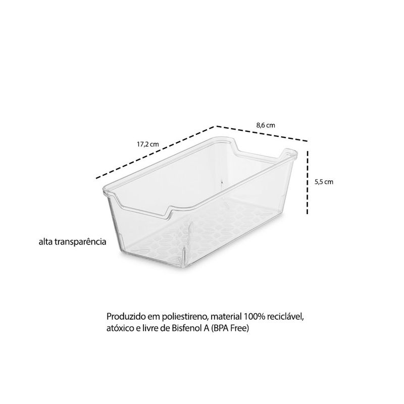 Caixa retangular pequena, organizador de gaveta transparente. Produzido em material atóxico, 100% reciclável e livre de Bisfenol A (BPA Free). O organizador de gaveta com design bonito, alta transparência e prático. Contêm: 1 Organizador de Gaveta Dimensão: 17,2 x 8,6 x 5,5 cm Material: Poliestireno