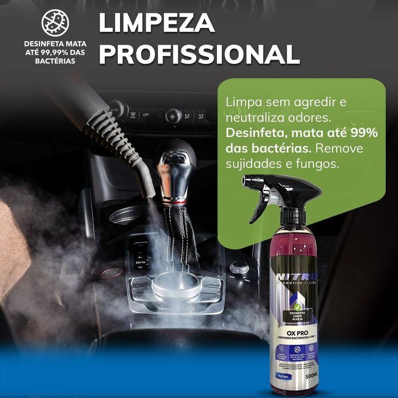 Ox Pro Limpeza Interna Nitro 500mlO Ox Pro Limpeza Interna Nitro 500ml é um limpador flotador bactericida e ultra concentrado, desenvolvido para a higienização completa do interior de veículos. Sua fórmula 7 em 1 é projetada para remover sujeiras difíceis, manchas de gordura e eliminar odores, além de possuir ação bactericida.Principais CaracterísticasFórmula 7 em 1: Limpa, higieniza e elimina bactérias e odores.Ultra Concentrado e pH Balanceado: Pode ser diluído em diferentes proporções dependendo do nível de sujeira, tornando-o versátil e econômico.Seguro para Superfícies: É adequado para uso em diversas superfícies internas automotivas, como painéis, laterais de portas, carpetes, estofados e bancos de couro.Alta Performance: Remove eficientemente manchas de gordura e sujeiras diversas.Modo de Uso e Diluição RecomendadaO produto é versátil e pode ser usado com diferentes diluições em água, dependendo da necessidade:Sujeira Pesada: Diluir 1:10 (1 parte de produto para 10 de água).Sujeira Média: Diluir 1:20.Sujeira Leve ou Manutenção: Diluir 1:50 (ideal para painéis e bancos de couro).Uso em Extratoras: Diluição de até 1:60.Uso em Tornador: Diluição de 1:10.Após a diluição, basta aplicar o produto na superfície, esfregar com um pano ou escova macia, se necessário, e remover o excesso com um pano de microfibra limpo e úmido.Conteúdo embalagem1 Ox Pro Limpeza Interna Nitro 500ml