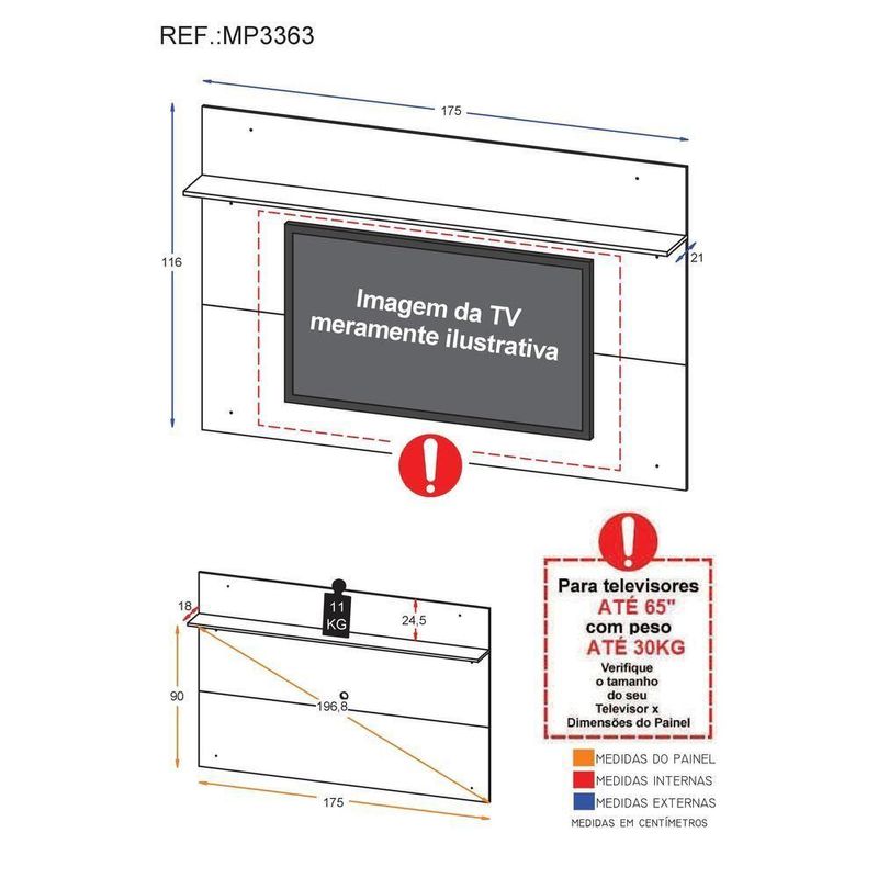 O Painel para até 65" com Prateleira Amsterdã Plus Multimóveis é produzido em MDP com acabamento acetinado, que garante maior durabilidade e facilidade na limpeza. Com espaçamento para passagem dos fios, que permite deixar os cabos mais organizados e o visual clean, conta com uma prateleira para acomodar objetos ou decoração e você escolhe a forma como quer montar: na parte superior ou inferior do painel. Com um ótimo custo-benefício, seu ambiente vai ficar mais funcional, já que o design contemporâneo permite utilizá-lo na sala, quarto, cozinha ou escritório. Conteúdo da Embalagem:1 (um) painel para 1 (um) kit com prateleira para painelDimensões do produto montado:Altura: 116cm | Largura: 175cm | Profundidade: 21cm*Devido as variações de tamanho dos televisores no mercado, sugerimos que verifique as medidas da sua e compare com o painel antes de efetuar a compra.*Você pode consultar as medidas internas na imagem técnica do produto.As cores do produto podem sofrer variações de tonalidade de acordo com as configurações do seu dispositivo.Imagem meramente ilustrativa. Decoração e eletros não acompanham o produto.O produto será entregue desmontado e não disponibilizamos o de montagem.