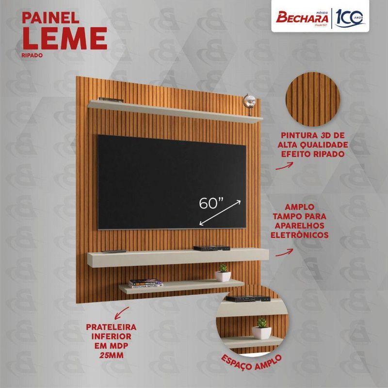 Painel Leme Tv Até 60 Polegadas Pintura Ripado Bechara Off White Com NaturalDecore sua sala com charme e modernidade utilizando o Painel Leme. Com espaco para TV de ate 60 polegadas ele possui espaco para seus objetos de decoracao e aparelhos eletronicos. Com um design moderno, ele proporciona um ambiente ideal para curtir seus filmes e programas de TV.Dimensoes: Altura: 160 cm | Largura: 150 cm | Profundidade: 28 cm Caracteristicas: - Estrutura MDP de 15 e 25 mm - Pintura 3D (efeito ripado) - Para TV ate 60 polegadas - Espaco para TV: Altura: 102 cm x Largura 150 cm - Acabamento Semi- Brilho - Nao acompanha suporte para TV - Suporte de peso 50 kg - Garantia de 03 meses ** Imagens ilustrativas. Objetos nao acompanham o produto. ** O produto e enviado desmontado. AVISO: Esclarecemos que a Opcao Moveis se responsabilizara pela entrega dos produtos adquiridos ate a porta de entrada ou portaria do endereco indicado, ou seja: e de total responsabilidade do cliente a montagem, desmontagem e instalacao do produto adquirido. Para evitar futuros desagrados ou imprevistos com a entrega, tambem e necessario que o cliente confira as dimensoes do produto escolhido, antes de finalizar a compra, devendo certificar-se de que a mercadoria passara normalmente por elevador, porta, escada e corredor.