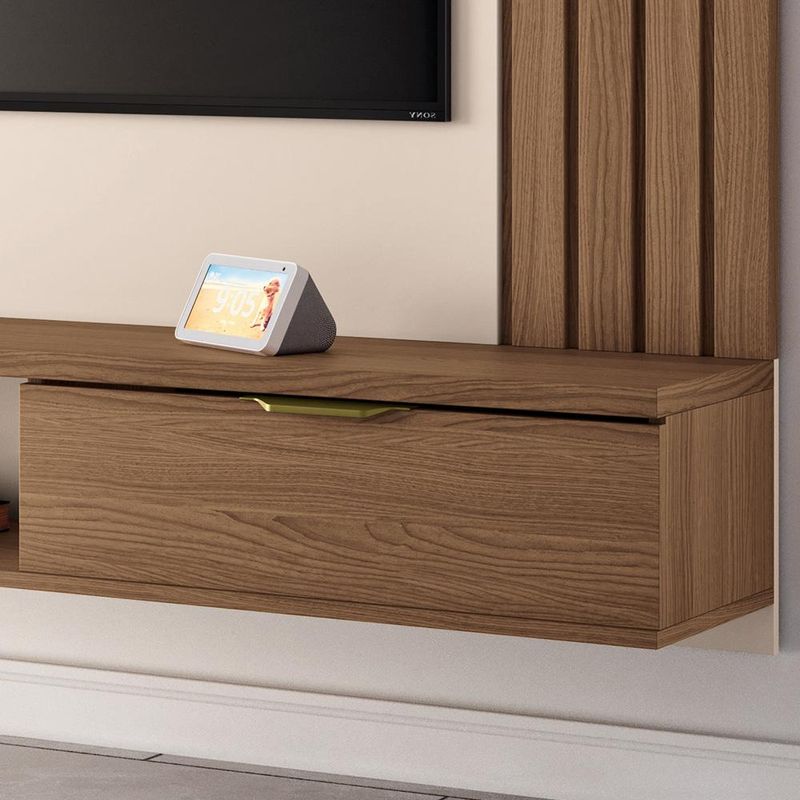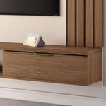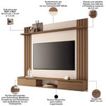 Inove sua sala de estar com o Painel para TV com Bancada Suspensa Soleil, da Lyam Decor, a solução ideal para quem busca aliar design moderno à funcionalidade. Esse painel suspenso é perfeito para otimizar o espaço, proporcionando uma fluidez que valoriza cada canto do ambiente. A estrutura inteligente do painel com bancada suspensa oferece espaço suficiente para acomodar sua TV de até 70 polegadas, além dos equipamentos eletrônicos de forma organizada. As portas basculantes são perfeitas para armazenar controles remotos, livros e acessórios, mantendo tudo ao seu alcance e livre de bagunça. Com isso, você terá um ambiente sempre arrumado e funcional. Enfim, esse painel para sala não apenas atende às suas necessidades de espaço e organização, mas também eleva o estilo da sua casa. Adicione um toque de sofisticação lar e transforme sua sala de estar em um verdadeiro refúgio de conforto e elegância com o Painel Soleil! Dimensões total do produto (L x A x P) 180 x 161 x 30,5 cm Medidas Internas Nicho central (L x A): 60 x 17,5 cm Profundidade tampo da bancada: 28 cm Prateleira superior (L x P): 180 x 15 cm Características: Estrutura em MDP e MDF de 25mm, 15mm e 12mm. Peças na cor Off White em impressão UV Alto Brilho e peças na cor Castanho com acabamento em impressão UV Texturizada. Ideal para TV de até 70 polegadas fixada no painel. Painel com detalhe ripado nas laterais. 02 portas basculantes com dobradiças metálicas. Puxadores em poliestireno com acabamento na cor champanhe. Prateleira superior e tampo com espessura de 25mm. Possui passa fios para melhor organização. Suporta até 40 kg distribuídos. - Produto entregue desmontado, acompanha manual de montagem. Sistema de montagem: Cavilhas, parafusos e girofix. - Este produto deve ser limpo com pano macio e seco. Não utilize produtos abrasivos como álcool e detergente, assim como esponjas rígidas ou palha de aço. - Proteja a superfície do móvel de objetos que transmitam calor ou umidade. Observações importantes: - Produto para uso residencial em ambiente interno, não devendo ficar exposto diretamente ao sol, calor e umidade excessivos. - Pode haver alguma diferença de tonalidade entre a imagem e o produto real, por conta do tratamento de imagens e a calibração de cores do seu monitor. - As imagens são meramente ilustrativas, não acompanham objetos de decoração e eletrônicos. - Ao receber a mercadoria, o cliente deve verificar as condições da embalagem, caso haja alguma avaria não assine o comprovante de recebimento. - Montagem, desmontagem e outras instalações serão de responsabilidade do cliente. Não nos responsabilizamos, no ato da entrega, por subir escadas/elevadores ou pelo transporte por guincho em apartamentos. Eventuais despesas são de responsabilidade do comprador. - Confira as dimensões do produto e certifique-se de que passará normalmente por supostos elevadores, portas, escadas e/ou corredores de sua residência.