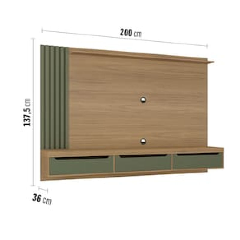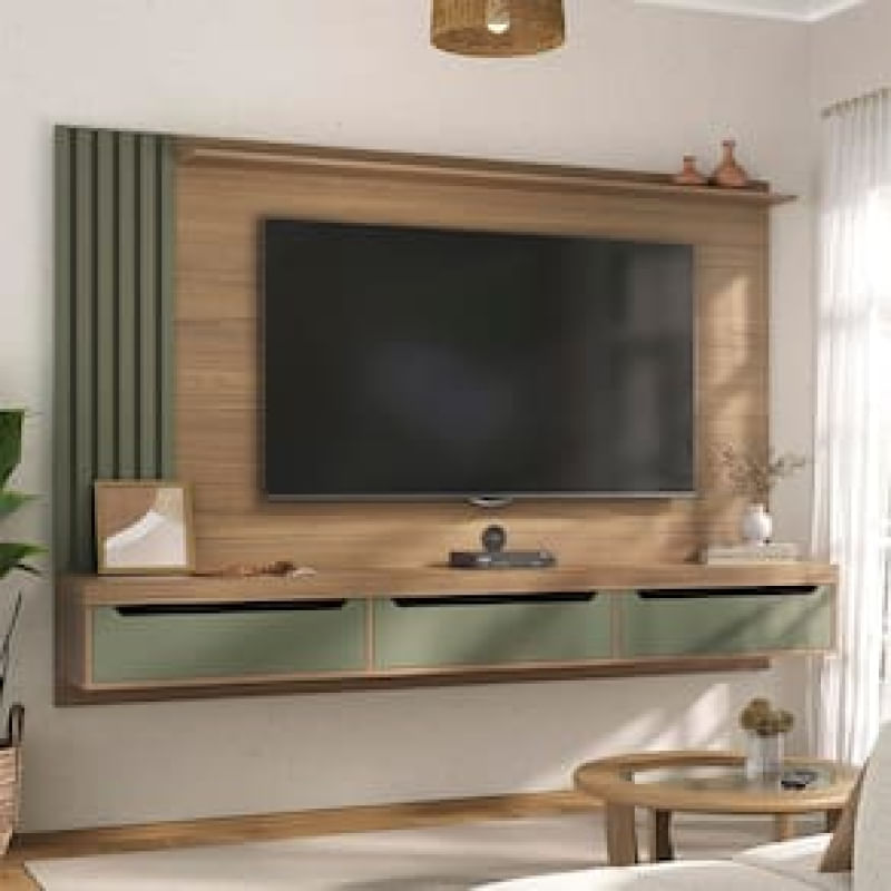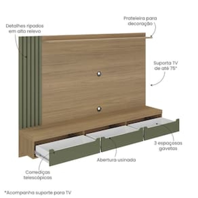 Sofisticação e Modernidade Renove sua sala com o Painel Presence, um móvel que combina elegância e praticidade. Os detalhes ripados conferem um toque moderno e sofisticado, transformando seu espaço em um ambiente único e elegante. Além de sua estética, este painel inclui um suporte para TV, garantindo praticidade e facilitando a instalação do seu aparelho. Organização Máxima Painel Presence conta com três gavetas com corrediças telescópicas, essas gavetas oferecem espaço extra para guardar objetos, documentos e outros itens importantes. A organização nunca foi tão fácil e eficiente, permitindo que você aproveite ao máximo o espaço disponível. Prateleira Superior e Tampo em Tamburato O Painel Presence é robusto e durável. Com o tampo em tamburato de 50mm proporciona resistência e solidez, garantindo um móvel de alta qualidade. A prateleira superior é ideal para exibir seus itens decorativos favoritos, adicionando charme e personalidade ao ambiente.