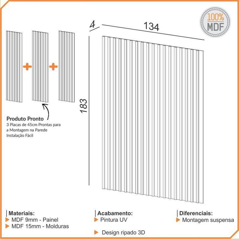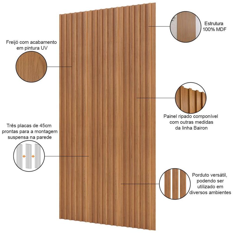 Apresentamos o incrível Painel Ripado Bairon 134x183, da Lyam Decor, uma peça versátil que transforma qualquer espaço com seu toque de sofisticação. Fabricado 100% em MDF, esse painel não somente proporciona resistência e durabilidade, como também se adapta perfeitamente ao estilo de vida de cada cliente, sendo totalmente componível de acordo com seu projeto pessoal. Além disso, é um modelo ideal para qualquer ambiente, já que harmoniza com salas de estar, quartos, corredores e halls de entrada. Seu design ripado moderno traz uma estética diferenciada, que enriquece a decoração e cria um clima aconchegante. As linhas geométricas criam profundidade e movimento, permitindo que você brinque com diferentes elementos decorativos, como quadros, plantas e objetos de arte. Com o Painel Ripado Bairon, você tem a liberdade de personalizar seu espaço, tornando-o único e exclusivo. Seja utilizando-o como um ponto focal ou como uma peça que complementa seu estilo, ele levará um novo significado aos seus ambientes, fazendo do seu lar um reflexo da sua personalidade! Adquira agora mesmo o seu e aproveite! Dimensões total do produto (L x A x P) 134 x 183 x 4 cm Características: Estrutura em 100% MDF 9mm e 15mm. Peça na tonalidade Freijó com acabamento em pintura UV. Três placas prontas para a montagem suspensa na parede. Pode ser utilizado em diversos ambientes. Painel ripado componível com outras medidas da linha Bairon. - Produto entregue desmontado, acompanha manual de montagem. - Este produto deve ser limpo com pano macio e seco. Não utilize produtos abrasivos como álcool e detergente, assim como esponjas rígidas ou palha de aço. - Proteja a superfície do móvel de objetos que transmitam calor ou umidade. Observações importantes: - Produto para uso residencial em ambiente interno, não devendo ficar exposto diretamente ao sol, calor e umidade excessivos. - Pode haver alguma diferença de tonalidade entre a imagem e o produto real, por conta do tratamento de imagens e a calibração de cores do seu monitor. - As imagens são meramente ilustrativas, não acompanham objetos de decoração e eletrônicos. - Ao receber a mercadoria, o cliente deve verificar as condições da embalagem, caso haja alguma avaria não assine o comprovante de recebimento. - Montagem, desmontagem e outras instalações serão de responsabilidade do cliente. Não nos responsabilizamos, no ato da entrega, por subir escadas/elevadores ou pelo transporte por guincho em apartamentos. Eventuais despesas são de responsabilidade do comprador. - Confira as dimensões do produto e certifique-se de que passará normalmente por supostos elevadores, portas, escadas e/ou corredores de sua residência.
