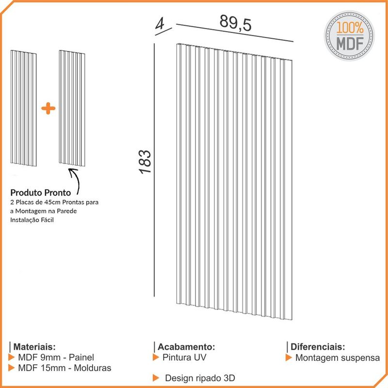 Apresentamos o incrível Painel Ripado Bairon 89x183cm, da Lyam Decor, uma peça versátil que transforma qualquer espaço com seu toque de sofisticação. Fabricado 100% em MDF, esse painel não somente proporciona resistência e durabilidade, como também se adapta perfeitamente ao estilo de vida de cada cliente, sendo totalmente componível de acordo com seu projeto pessoal. Além disso, é um modelo ideal para qualquer ambiente, já que harmoniza com salas de estar, quartos, corredores e halls de entrada. Seu design ripado moderno traz uma estética diferenciada, que enriquece a decoração e cria um clima aconchegante. As linhas geométricas criam profundidade e movimento, permitindo que você brinque com diferentes elementos decorativos, como quadros, plantas e objetos de arte. Com o Painel Ripado Bairon, você tem a liberdade de personalizar seu espaço, tornando-o único e exclusivo. Seja utilizando-o como um ponto focal ou como uma peça que complementa seu estilo, ele levará um novo significado aos seus ambientes, fazendo do seu lar um reflexo da sua personalidade! Adquira agora mesmo o seu e aproveite! Dimensões total do produto (L x A x P) 89,5 x 183 x 4 cm Características: Estrutura em 100% MDF 9mm e 15mm. Peça na tonalidade Freijó com acabamento em pintura UV. Duas placas de 45cm prontas para a montagem suspensa na parede. Pode ser utilizado em diversos ambientes. Painel ripado componível com outras medidas da linha Bairon. - Produto entregue desmontado, acompanha manual de montagem. - Este produto deve ser limpo com pano macio e seco. Não utilize produtos abrasivos como álcool e detergente, assim como esponjas rígidas ou palha de aço. - Proteja a superfície do móvel de objetos que transmitam calor ou umidade. Observações importantes: - Produto para uso residencial em ambiente interno, não devendo ficar exposto diretamente ao sol, calor e umidade excessivos. - Pode haver alguma diferença de tonalidade entre a imagem e o produto real, por conta do tratamento de imagens e a calibração de cores do seu monitor. - As imagens são meramente ilustrativas, não acompanham objetos de decoração e eletrônicos. - Ao receber a mercadoria, o cliente deve verificar as condições da embalagem, caso haja alguma avaria não assine o comprovante de recebimento. - Montagem, desmontagem e outras instalações serão de responsabilidade do cliente. Não nos responsabilizamos, no ato da entrega, por subir escadas/elevadores ou pelo transporte por guincho em apartamentos. Eventuais despesas são de responsabilidade do comprador. - Confira as dimensões do produto e certifique-se de que passará normalmente por supostos elevadores, portas, escadas e/ou corredores de sua residência.