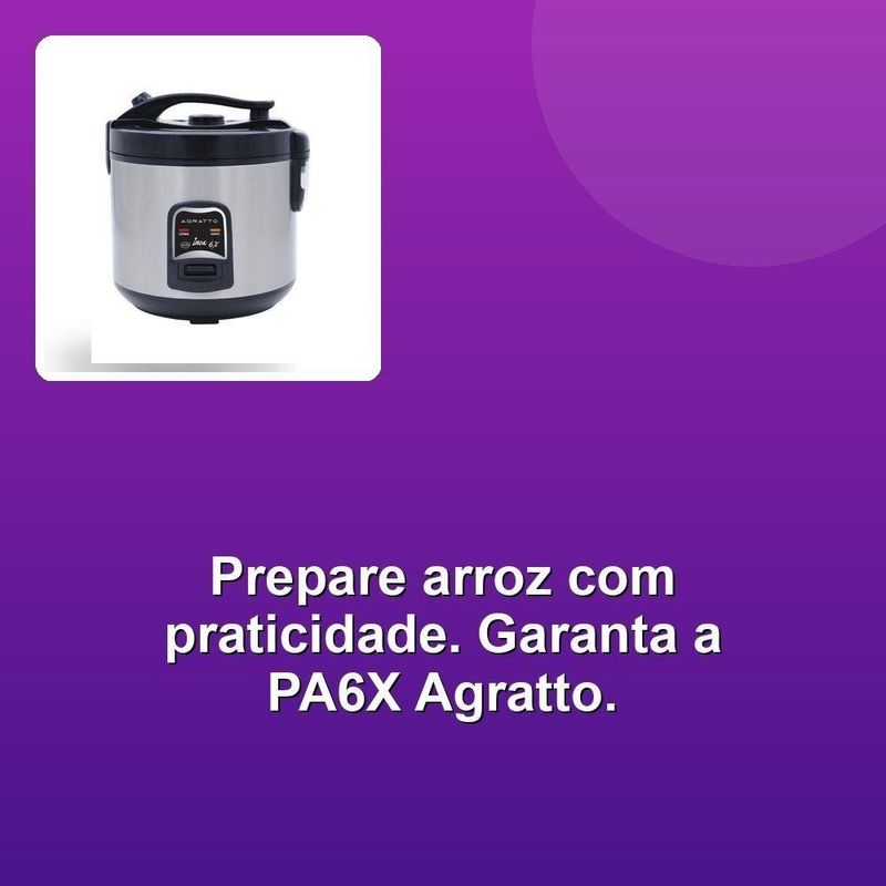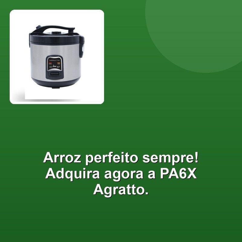 Panela De Arroz Agratto Pa6x400W Inox 110VDesvende o segredo de refeições práticas e saborosas com a Panela de Arroz Agratto PA6X. Com sua potência de 400W e capacidade para até 6 xícaras de arroz, você prepara o arroz perfeito para toda a família e ainda aproveita a versatilidade de uma bandeja especial para legumes, cozinhando ingredientes deliciosos de forma simultânea.A Panela PA6X é mais que um eletrodoméstico, é a solução para suprir suas necessidades culinárias com praticidade e eficiência. Após o cozimento, o arroz se mantém aquecido na panela, garantindo temperatura ideal até o momento de servir. A cuba antiaderente facilita a limpeza, liberando você de tarefas chatas e transformando o preparo de refeições em um momento prazeroso. Com design elegante em inox e dimensões compactas, ela se encaixa perfeitamente na sua cozinha, valendo o espaço e encantando o seu dia a dia.Invista em praticidade e sabor, experimente a Panela de Arroz Agratto PA6X e revolucione suas refeições.Desvende o segredo de refeições práticas e saborosas com a Panela de Arroz Agratto PA6X. Com sua potência de 400W e capacidade para até 6 xícaras de arroz, você prepara o arroz perfeito para toda a família e ainda aproveita a versatilidade de uma bandeja especial para legumes, cozinhando ingredientes deliciosos de forma simultânea.A Panela PA6X é mais que um eletrodoméstico, é a solução para suprir suas necessidades culinárias com praticidade e eficiência. Após o cozimento, o arroz se mantém aquecido na panela, garantindo temperatura ideal até o momento de servir. A cuba antiaderente facilita a limpeza, liberando você de tarefas chatas e transformando o preparo de refeições em um momento prazeroso. Com design elegante em inox e dimensões compactas, ela se encaixa perfeitamente na sua cozinha, valendo o espaço e encantando o seu dia a dia.Invista em praticidade e sabor, experimente a Panela de Arroz Agratto PA6X e revolucione suas refeições.