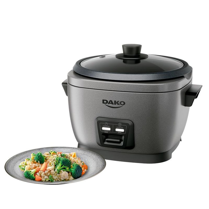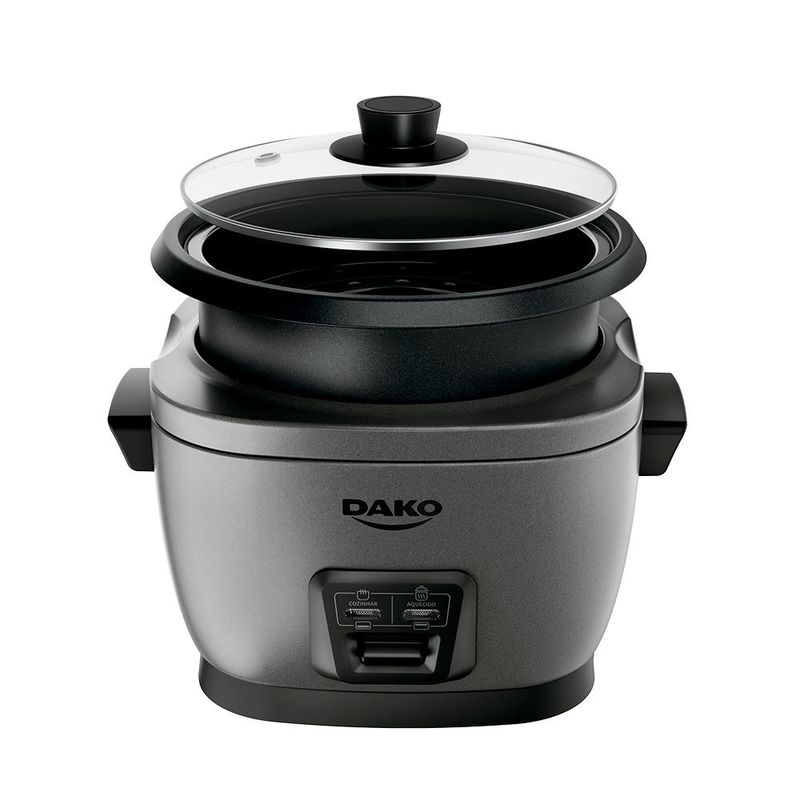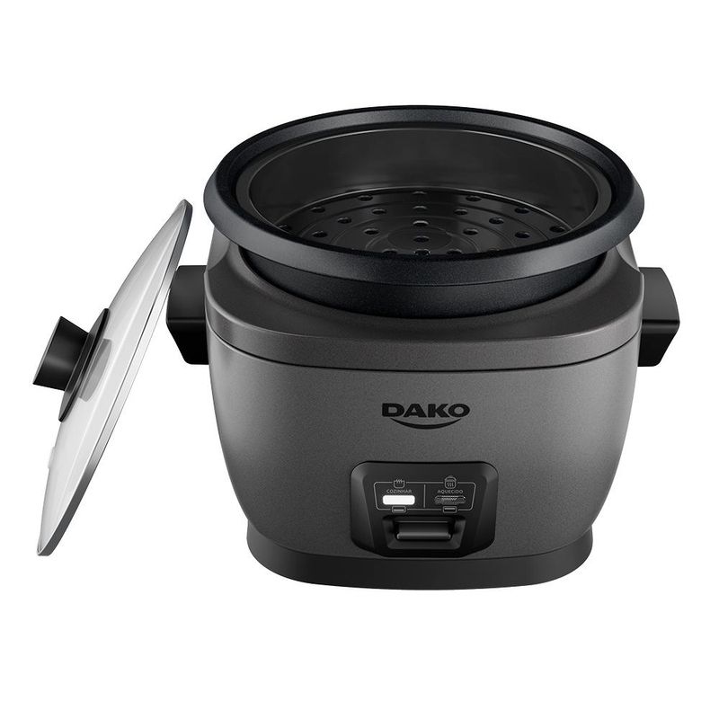 Que tal experimentar a praticidade que a Panela de Arroz Elétrica Dako pode trazer para suas refeições?Com capacidade para até 10 xícaras de arroz, ela é uma verdadeira parceira na cozinha. Você não precisa ficar abrindo a tampa toda hora para conferir o ponto do cozimento, já que a tampa de vidro permite acompanhar o preparo sem estresse.Com a função de desligamento automático, o arroz fica sempre soltinho e no ponto certo, sem complicação.Para quem busca preservar os nutrientes e o sabor dos alimentos, o cozimento a vapor é a escolha ideal. A cuba antiaderente evita que a comida grude e é super fácil de limpar. Ela vem com tudo que você precisa: copo medidor, bandeja perfurada e colher.E não se preocupe: a função manter aquecido garante que seus pratos fiquem quentinhos até a hora de servir. Depois de cozinhar, é só retirar o cabo, levar à mesa e se servir.Tudo isso com a qualidade que você merece com o preço que cabe no bolso. Afinal, são anos de história acompanhando você na cozinha e oferecendo produtos modernos para tornar sua rotina ainda mais fácil.Você vai perceber: na hora de comprar, a Dako surpreende!Atributos e Benefícios- Arroz soltinho sem passar do ponto – Desligamento Automático.- Faça mais em menos tempo – Prepare de risotos, macarrão e outros alimentos.- Acompanhe o preparo – Tampa de vidro com saída de vapor.- Com tudo que você precisa – Copo medidor, bandeja perfurada e colher.- Sua rotina ainda mais saudável – Cozinhe no vapor com a bandeja perfurada.- Comidas quentinhas por mais tempo – Função Manter Aquecido.Ficha TécnicaCor do Produto: CinzaTipo de Acabamento: PretoPotência: 700WVoltagem: 127V e 220VCapacidade: 4L / 10 xícarasFunção Manter Aquecido: SimRevestimento Antiaderente: SimAcessórios Inclusos: Copo medidor, colher e tigela de vaporDimensões do Produto: Largura 31,2 x Altura 23,8 x Profundidade 27,6 cmComprimento do Cabo: 0,8 mTipo de Plugue: 10A