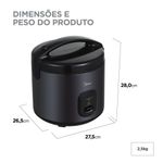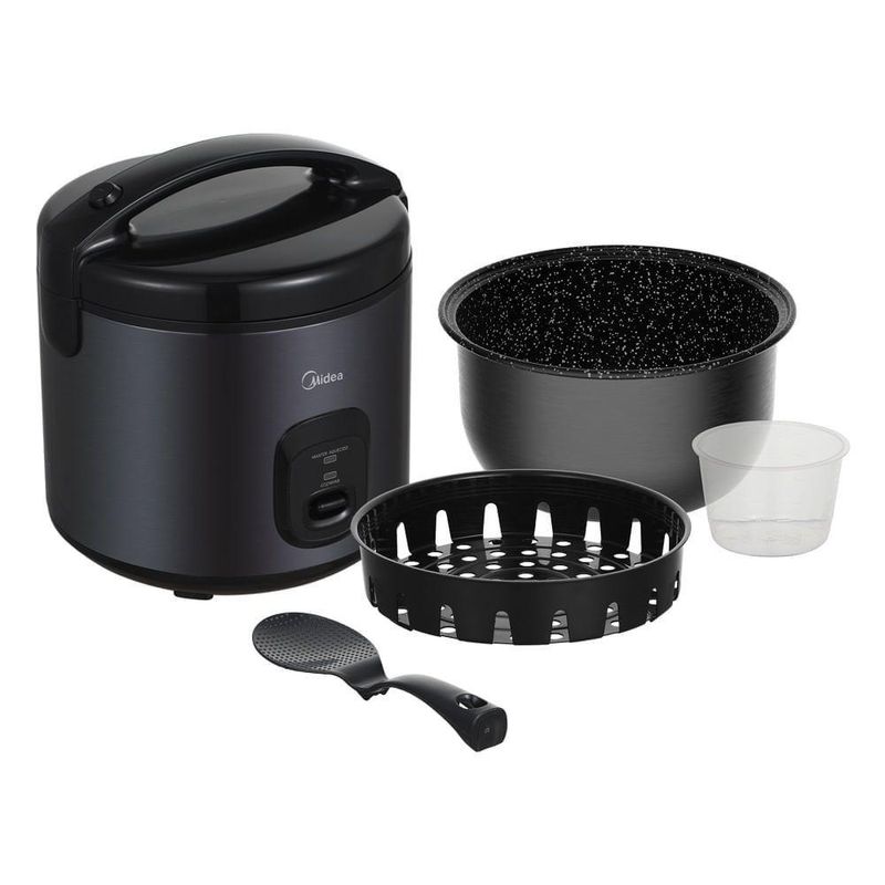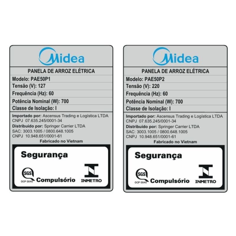 Panela de Arroz Elétrica Midea 5L Preta PAE50P2 - 220V A Panela de Arroz Elétrica Midea 5L tem tudo para ser sua grande aliada no dia a dia na cozinha! Com capacidade para porções generosas, ela é ideal para famílias e reuniões com amigos. Destaques do Produto Revestimento BlackStone: Não gruda, não descasca e é fácil de limpar. Função Manter Aquecido: Mantém o arroz na temperatura ideal após o preparo. Bandeja para cozimento a vapor: Prepare legumes de forma prática e saudável, preservando os nutrientes e o sabor natural dos alimentos. Acessórios Inclusos Colher Copo medidor Bandeja para cozimento a vapor Cabo de alimentação Manual do usuário Obs.: Não acompanha concha. Cabo de alimentação não é destacável. Não inclui livro de receitas. Atenção: Esta loja não fatura para CNPJ. Especificações Técnicas Marca: Midea Tipo de produto: Panela de Arroz Código do Produto: PAE50P1.PAE50P2 Origem: Importado Cor: Preto Capacidade: 5 Litros Voltagem: 220V Display: Mecânico Funções: Cozinhar / Manter Aquecido Produto conectado: Não Receitas pré-programadas: Não Cozimento lento: Não Timer: Não Desligamento automático: Não Material externo: Inox / Plástico Panela interna antiaderente: Sim (Revestimento BlackStone) Altura: 28,0 cm Largura: 27,5 cm Comprimento: 26,5 cm Peso: 2,5 kg Altura Embalado: 30,5 cm Largura Embalado: 31,0 cm Comprimento Embalado: 31,0 cm Peso Embalado: 3,0 kg Garantia: 12 meses