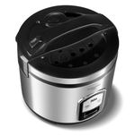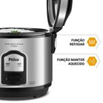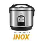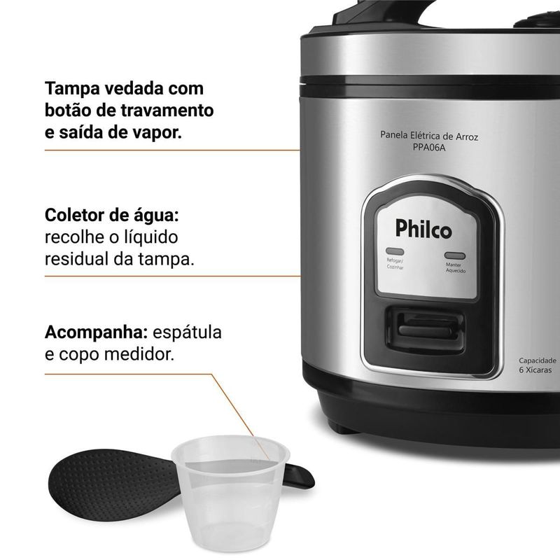 Prepare deliciosos pratos com a Panela de Arroz Elétrica Philco 6 Xícaras Inox Visor Glass 400W PPA06A, a solução ideal para quem busca praticidade e eficiência na cozinha. Com capacidade para 6 xícaras, ela atende perfeitamente às necessidades de famílias e pessoas com rotina agitada, oferecendo porções ideais para o dia a dia.Sua potência de 400W garante um cozimento rápido e uniforme, deixando o arroz soltinho e saboroso sem esforço. O acabamento em inox da Panela de Arroz Philco traz elegância e durabilidade, enquanto a tigela com revestimento antiaderente facilita a limpeza, evitando que o arroz grude e garantindo refeições sem complicação.A tampa com Visor Glass permite acompanhar o preparo sem precisar abrir, preservando o vapor e o sabor dos alimentos. Além disso, a Panela de Arroz PPA06A possui vedação segura com botão de travamento e saída de vapor, garantindo mais segurança no uso. O cordão elétrico removível possibilita levar a panela diretamente à mesa, adicionando praticidade e conveniência à sua rotina.Invista na Panela de Arroz Elétrica Philco PPA06A e traga mais conforto, sabor e organização para sua cozinha. Uma aliada perfeita para preparar arroz, legumes e muito mais com agilidade e estilo.Capacidade da tigela em xicaras: 6 xícaras de arroz cruCapacidade de 2LPotência: 400WRevestimento Antiaderente da tigelaTampa com Visor GlassFunções: Cozinhar, refogar, manter aquecidoTigela removívelAlças somente na tampaCordão removívelLuz indicadora Desligamento automáticoA tigela pode ser levada à lava-louçasColetor de água removível para limpezaBandeja para cozimento de legumes no vapor.