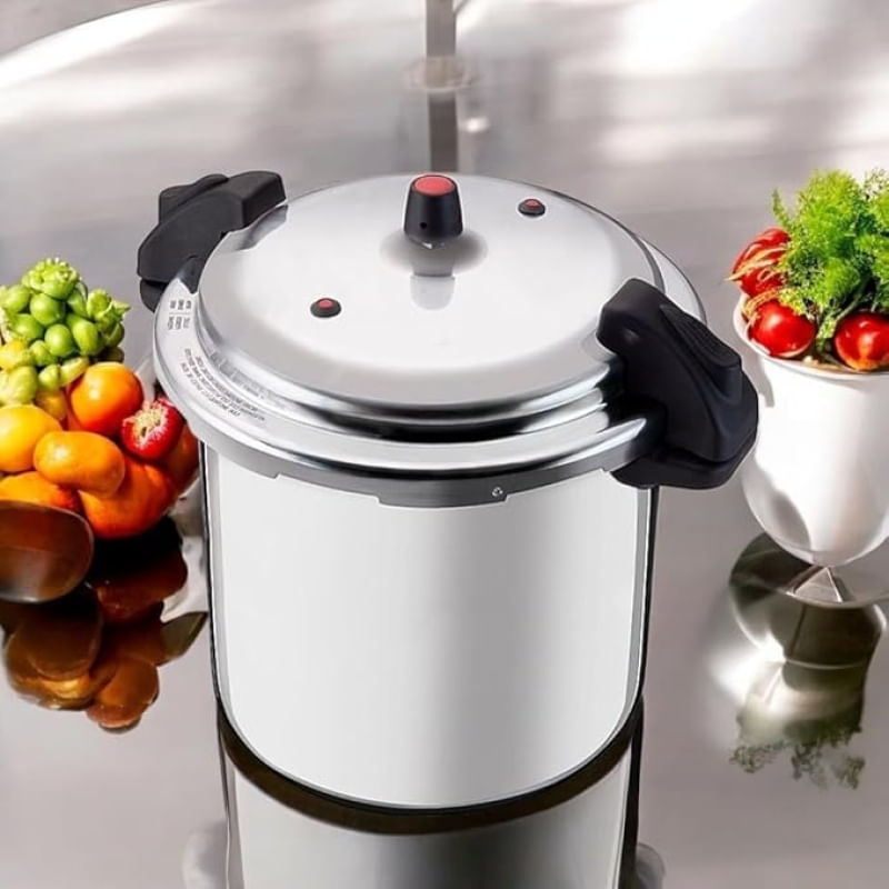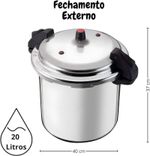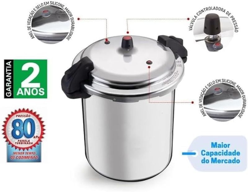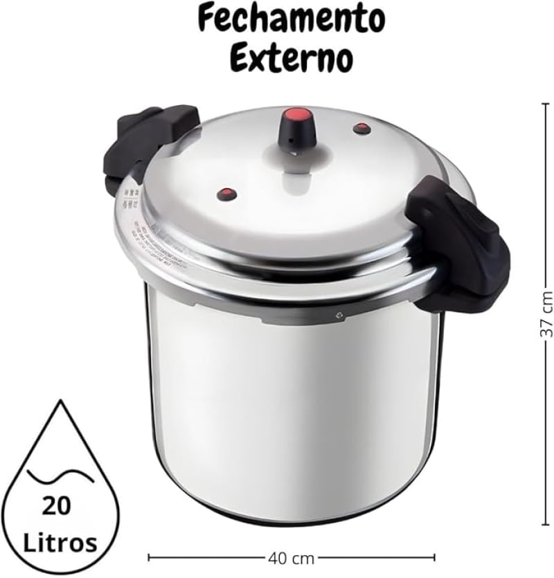 Panela Pressão 24 Litros Fechamento Externo: Segurança e Capacidade! A panela de pressão ideal para grandes famílias e preparos generosos! Com capacidade de 24 litros, é perfeita para cozinhar carnes, legumes e refeições completas com máxima segurança. Fechamento externo que garante praticidade e proteção durante o uso. Segurança Máxima e Cozimento Rápido! Duas válvulas de segurança e alça antitérmica para manuseio seguro. Fabricada em alumínio de alta qualidade que distribui calor uniformemente. Registro INMETRO que assegura qualidade e conformidade com normas técnicas. Vantagens Exclusivas da Nossa Panela: Ampla Capacidade: 24 litros para grandes preparos Fechamento Externo: Máxima segurança e praticidade Duas Válvulas: Proteção extra contra excesso de pressão Alça Antitérmica: Manuseio seguro sem queimaduras Material Durável: Alumínio de alta resistência Qualidade Certificada: Registro INMETRO 002680/2019 Prepare refeições deliciosas com eficiência, capacidade e tranquilidade! Ficha Técnica Especificação Detalhe Produto Panela de Pressão 24 Litros Capacidade 24 Litros Material Alumínio Dimensões 40,8cm (A) x 35,5cm (Diâmetro) Recursos Fechamento Externo, 2 Válvulas Certificação INMETRO 002680/2019 Peso Aprox. 5kg