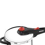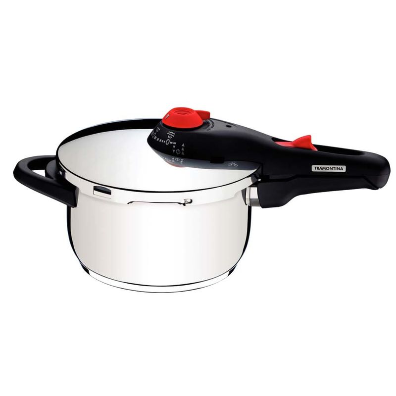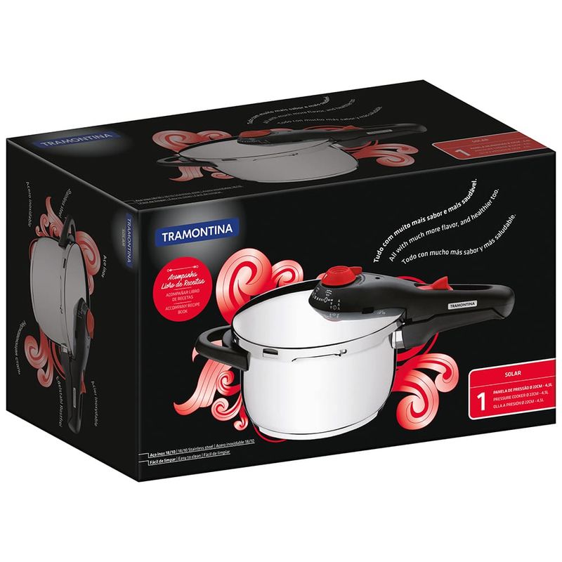 Além de ter um moderno acabamento em Inox, a Panela de Pressão Solar da Tramontina conta com um fundo triplo composto de inox e alumínio que distribui o calor uniformemente, o cozimento de seus alimentos será mais rápido e econômico. Sua refeição ficará mais saborosa e aquecida por mais tempo.Ela vem com medidor interno de volume para facilitar a medida certa para o preparo de seus alimentos. Sua alça e cabo são antitérmicos, ajudando a evitar queimaduras. Conta com 5 dispositivos integrados de segurança e é aprovada pela norma Nacional de Segurança. Mais praticidade cozinhando em diversos tipos de fogões. A Panela de Pressão Solar pode ser utilizada em fogões por indução, a gás, elétrico e os de vitrocerâmica.
