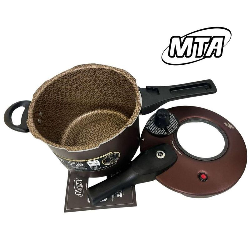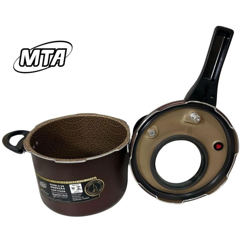 Panela de Pressão 6603 Fechamento Externo Alumínio Antiaderente 4,5L Visor Grande MarromPrepare receitas saborosas com a panela de pressão MTA 6603, ideal para o dia a dia na cozinha. Com capacidade de 4,5 litros e fechamento externo, ela ajuda a agilizar o cozimento dos alimentos com praticidade. O corpo em alumínio garante melhor condução de calor, enquanto o revestimento antiaderente Superflon Ultra de sete camadas facilita o manuseio e a limpeza. O grande visor na tampa permite acompanhar o nível de água e o ponto do preparo sem abrir a panela. Com design marrom, integra funcionalidade e estilo para diferentes tipos de cozinha.Vantagens e diferenciais Capacidade de 4,5 L: ideal para preparar refeições para toda a família. Alumínio condutor de calor: cozinha os alimentos mais rápido e de forma uniforme. Revestimento antiaderente Superflon Ultra: evita que os alimentos grudem e facilita a limpeza. Visor grande na tampa: permite acompanhar o cozimento e o nível de água sem abrir a panela. Fechamento externo com guia: proporciona uso mais prático e seguro no dia a dia.Especificações Técnicas Marca: MTA Modelo: 6603 Tipo: Panela de pressão Capacidade: 4,5 L Material da panela: Alumínio Revestimento interno: Antiaderente Superflon Ultra Cor predominante: Marrom Fechamento: Externo com guia de fechamento na tampa Visor: Visor grande removível para limpeza Altura do produto: 16 cm Largura/diâmetro do produto: 20 cm Peso do produto: 2,060 kg Capacidade em volume: 4,5 litros Garantia do fabricante: 3 mesesObservações importantes As cores do produto podem variar de acordo com a calibração e resolução do monitor ou tela utilizada. As imagens são meramente ilustrativas; o produto real pode apresentar pequenas variações de tonalidade, formato ou acabamento.