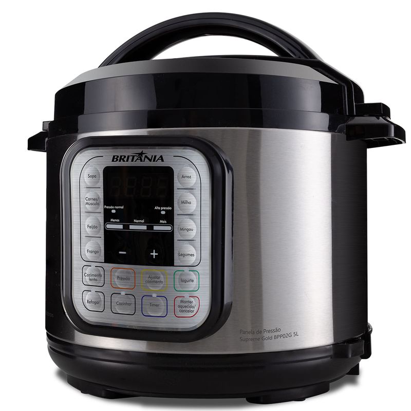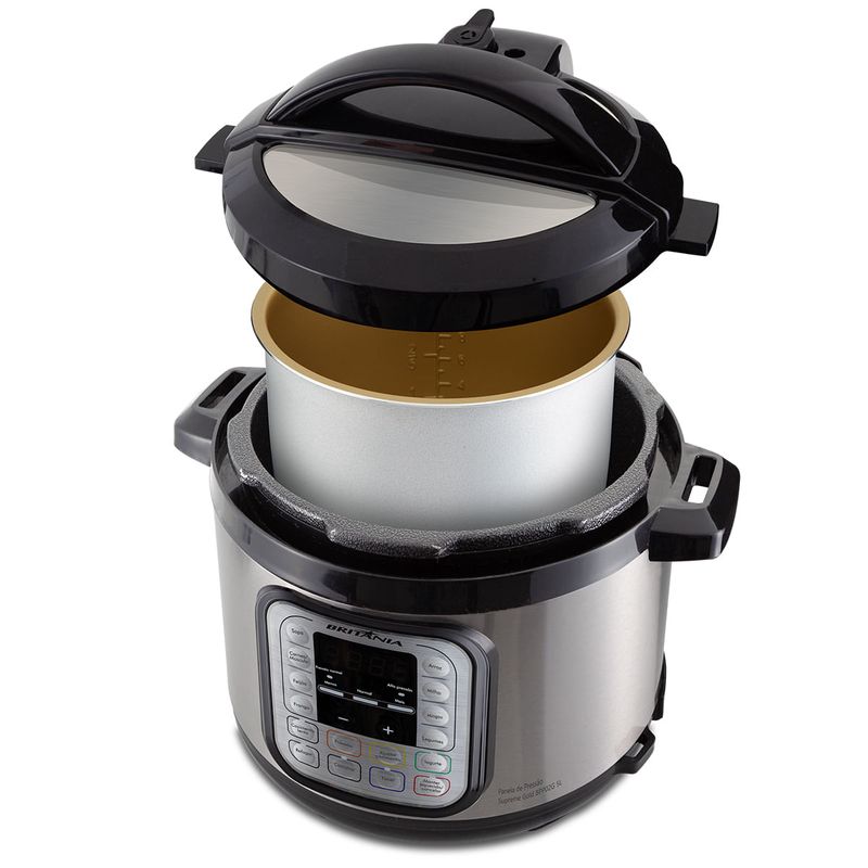 Cozinhe com maior praticidade e sabor coma Panela de Pressão Britânia Revestimento Gold BPP02G 900W! Ela traz 11 programas de cozimento pré-definidos. Basta colocar o alimento dentro, selecionar a opção, e pronto! Você também tem a opção de programar o cozimento automático com até 24 horas de antecedência. Muito mais praticidade dentro da cozinha, simples assim. Mais praticidade para cozinhar o feijão que a família toda gosta. Prepare refeições tamanho família! Graças a sua incrível capacidade de 5L . Maior durabilidade e poder de antiaderente com revestimento Revestimento Gold. Preparos e limpeza muito mais fáceis. Sirva os alimentos quentes e saborosos quando você quiser, isso porque a função "Manter Aquecido" mantém a temperatura por muito mais tempo. Além de trazer a função “Manter Aquecido”, que permite servir os alimentos aquecidos por muito mais tempo. E não se preocupe, os alimentos não irão grudar graças ao seu revestimento antiaderente “Dura Mais”. Possibilitando uma limpeza muito mais fácil. E para evitar qualquer acidente, a Panela de Pressão Britânia Multifuncional Digital BPP2PI conta com 9 sistemas de segurança, para que você cozinhe de forma muito mais tranquila e segura! • Prepara diversos tipos de alimentos, feijão carnes, arroz, canjica, legumes entre outros, • Painel com controle digital e fácil acesso as funções; • Visor digital para acompanhamento da programação e dos preparos; • Possui 11 modos de cozimento pré-programado, permite iniciar o cozimento com apenas um toque; • Modos de cozimento pré-programados: Sopa, Carnes/Músculo, Feijão, Frango, Arroz, Milho, Pudim, Legumes, Iogurte, Cozimento Lento, Refogar. • Função manter aquecido, mantém os alimentos aquecidos após o preparo. Pode ser usada para aquecer os alimentos a uma temperatura aproximada de 70°C; • Função refogar, para dourar temperos e outros alimentos antes de cozinhar na pressão; • Função cozinhar, permite programar o tempo de cozimento manualmente • Função Pressão permite ajustar o nível de pressão para o cozimento, nível normal e alta pressão • Função cozimento lento, permite cozinhar alimentos em temperaturas mais baixas por até 12horas • Timer programável, permite programar o preparo dos alimentos com até 24 hora de antecedência; • Tigela removível com capacidade de 5L, possui revestimento interno antiaderente, fácil de usar e limpar. • A tigela possui escalas para preparar até 10 xícaras de arroz cru; • Acompanha colher e copo dosador; • Suporte para apoiar a colher no produto; • Possui 9 sistemas de segurança; • Tampa com trava de segurança; • Válvula de controle de vapor removível, • Alças laterais, facilidade para transportar o produto; • Silenciosa, não libera vapor durante o cozimento dos alimentos; • Alças laterais com encaixes para apoiar a tampa; • Cordão elétrico removível, permite levar a panela à mesa com facilidade; • Pés antiderrapantes; • Acabamento em inox; • Composição: metal, plástico e tigela em alumínio;