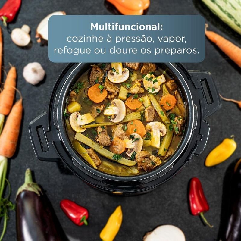 A Panela de Pressão Elétrica Black+Decker PP900G Gourmand Gris 5L 900W une design moderno e praticidade para transformar a sua rotina na cozinha. Com capacidade de 5 litros e potência de 900W, ela prepara receitas variadas de forma rápida, segura e saborosa. Multifuncional, permite cozinhar sob pressão, preparar alimentos no vapor, refogar ou até mesmo dourar, garantindo versatilidade no dia a dia. Conta com 11 receitas pré-programadas e a função adiar início, que possibilita programar o preparo conforme sua necessidade.A segurança é um dos destaques do modelo: são 9 dispositivos de proteção, incluindo tampa vedada, botão de travamento e saída controlada de vapor. Além disso, possui aviso sonoro ao finalizar o cozimento e a função manter aquecido, que conserva a temperatura dos alimentos até a hora de servir. O recipiente interno é removível, com revestimento antiaderente certificado pelo FDA, seguro para sua saúde e de fácil limpeza, inclusive compatível com lava-louças. Para maior comodidade, acompanha acessórios práticos: grelha de cozimento a vapor, copo medidor e colher.Capacidade de 5 litros, até 21 xícaras11 receitas pré-programadas + ajustes manuais9 dispositivos de segurança integradosFunção manter aquecido e adiar inícioCertificação INMETRO: UL-OCP-0029Recipiente removível com revestimento antiaderente FDACompatível com lava-louças para facilitar a limpezaCom design sofisticado da linha Gourmand Gris, a Panela de Pressão Elétrica Black+Decker PP900G agiliza o preparo dos alimentos com muita segurança e praticidade. Mude para melhor e facilite sua vida!
