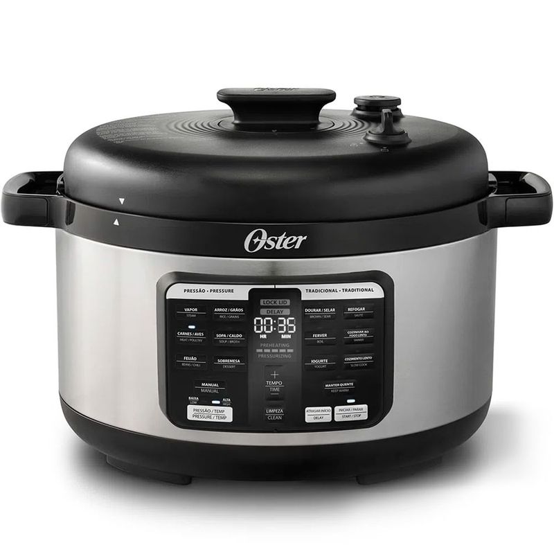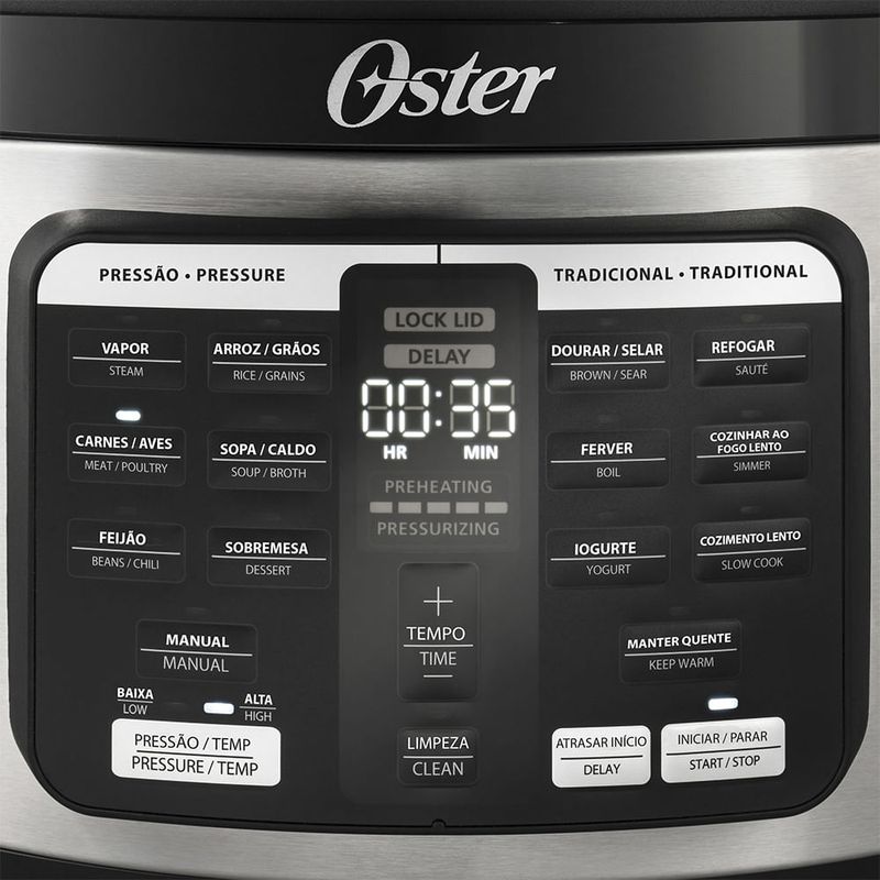 A Panela Elétrica Multifunções Oster® é a solução para tornar a rotina da sua cozinha ainda mais fácil e ágil. Cozinhe 70% mais rápido do que usando fornos convencionais e realize preparos com 2x mais velocidade que uma panela de pressão tradicional. • 5,7 L DE CAPACIDADE • 70% MAIS RÁPIDO QUE FORNOS CONVENCIONAIS • 2X MAIS VELOZ QUE PANELAS DE PRESSÃO • 15 FUNÇÕES • FORMATO OVAL - MAIS ECONOMIA: MENOS ÁGUA, ENERGIA E GÁS Nossa panela elétrica usa menos água para cozinhar, pois não libera tanto vapor. Faz você ganhar tempo, porque cozinha mais rápido. Traz economia, não usa o gás de cozinha. - 15 FUNÇÕES PRÉ-PROGRAMADAS Prepare: Arroz e Risotos; Massas; Carnes; Vegetais; Grãos e Caldos; e Sobremesas. Aproveite a agilidade de escolher entre as funções: pressão, panela de arroz, Slow Cooker, refogar, selar, ferver, manter aquecido, molhos, aves e carnes, feijão, sopa, grãos, iogurte, sobremesas e auto limpeza. Todas com apenas 1 clique. - DESIGN OVAL CAPACIDADE DE 5,7L O design oval de grande capacidade possibilita acomodar os alimentos em pedaços maiores sem ter que cortar, picar ou empilhar. Prepare porções maiores, mais deliciosas e com a segurança de mexer suas receitas com uma só mão sem girar a panela. - SISTEMAS DE SEGURANÇA Você e sua família mais protegidos por um conjunto de sistema de segurança completo e eficaz, com sensores, válvulas, travas automáticas e manuais visíveis na tampa que trazem segurança as saídas de vapor. - BOTÃO PARA FÁCIL LIBERAÇÃO DE VAPOR O botão é posicionado em um local afastado da saída de vapor, trazendo ainda mais segurança durante o uso. BIOCERAMIC™ Revestimento Cerâmico – Com Infusão de Azeite – Durável – Fácil de Limpar - LIMPEZA RÁPIDA Elimine facilmente a sujeira e os odores da sua panela com o toque de apenas um botão. E MAIS Acessórios para tornar o seu uso ainda mais prático: Colher medidora, grelha e borracha de vedação para a tampa. PANELA ELÉTRICA MULTIFUNÇÕES Design multifuncional para a sua cozinha!