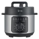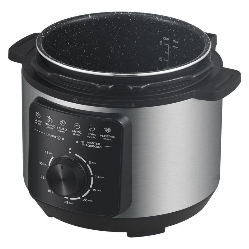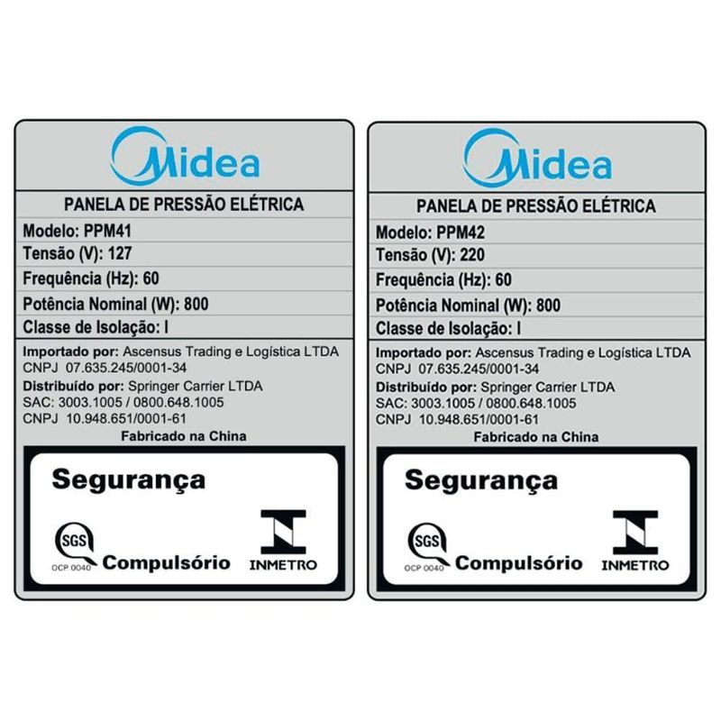 Panela De Pressão Mecânica Preta E Inox 4L Midea PPM41 110VPanela de Pressão Elétrica Midea 4L com Revestimento AntiaderenteA Panela de Pressão Mecânica Midea de 4 litros alia praticidade e conforto ao dia a dia. Com 9 dispositivos de segurança, ela é perfeita para preparar todas as suas receitas com a máxima tranquilidade. O material externo em aço inoxidável escovado e a panela interna antiaderente Blackstone, que não gruda, garantem durabilidade e facilidade na limpeza.Principais Características:Multifuncional 4 em 1: Um aparelho versátil que cozinha sob pressão, assa, refoga e frita, trazendo muito mais possibilidades para a sua cozinha com a praticidade de um único produto.Máxima Segurança: Cozinhe sem preocupações. A panela conta com 9 dispositivos de proteção, incluindo sensores de fechamento da tampa e de temperatura, para garantir a segurança de toda a família.Revestimento Antiaderente BlackStone: A panela interna possui o exclusivo revestimento BlackStone, que não deixa os alimentos grudarem, não descasca e é muito mais fácil de limpar.Design em Aço Inox: O acabamento externo em aço inoxidável escovado confere um visual moderno e sofisticado, além de garantir maior resistência e durabilidade.Operação Simples: Rápida e prática de usar. Com apenas um giro no timer mecânico, sua panela já está funcionando, sem complicações.Especificações Técnicas:Marca: MideaModelo: PPM41Voltagem: 110VTipo: Panela de Pressão ElétricaCapacidade Total: 4 LitrosPotência: 800WTimer: Mecânico (até 45 minutos)Revestimento Interno: Antiaderente BlackStoneCor: Preto e InoxPeso: 4,1 kgDimensões [AxLxP]: 31 x 30,5 x 30,5 cmGarantia: 12 meses