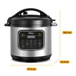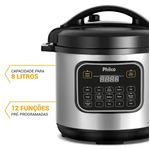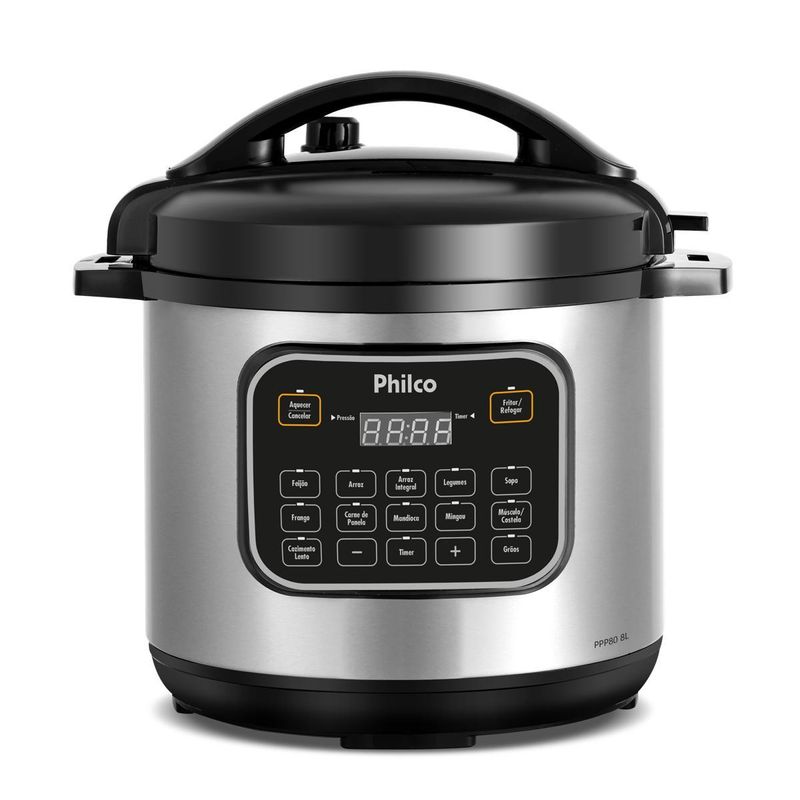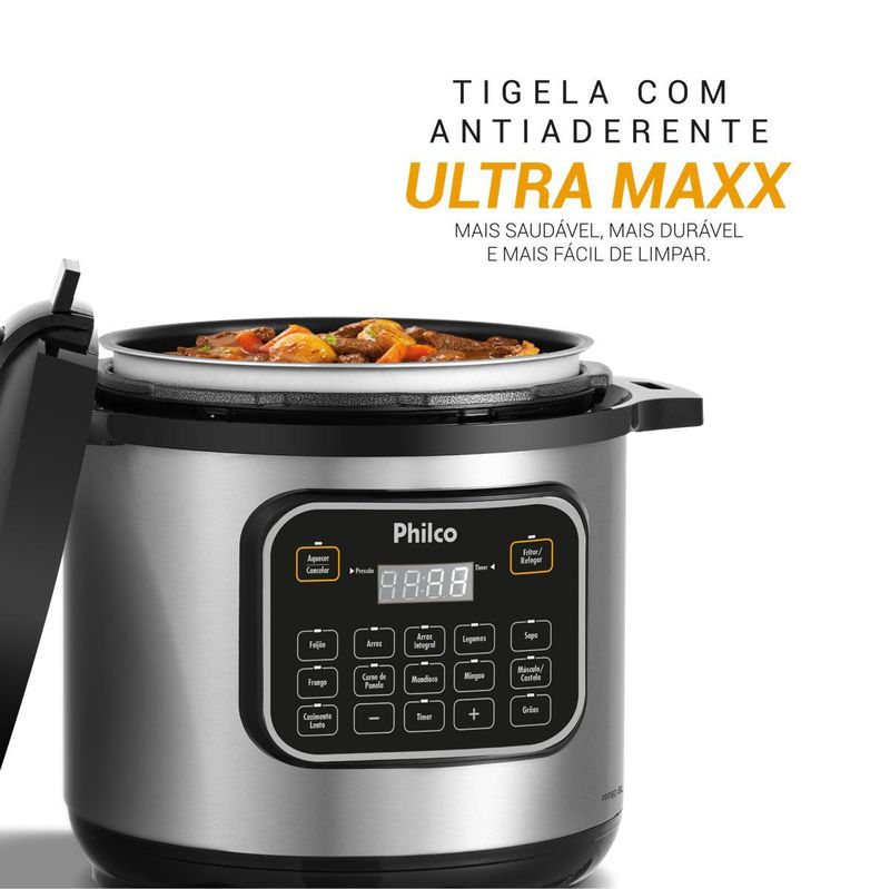 Imagine preparar refeições deliciosas e saudáveis com facilidade. A Panela de Pressão Multifuncional Philco 8L PPP80 é a escolha ideal para quem busca conveniência e eficiência na cozinha. Com capacidade de 8 litros, você cozinha para toda a família sem se preocupar com espaço limitado. O painel digital com 12 modos de cozimento pré-programados permite preparar pratos variados com o toque de um botão. A função Grãos ajusta o tempo de cozimento para diferentes tipos de grãos, como milho, lentilha, grão de bico e pinhão. Sinta a satisfação de cozinhar mais rápido e economizar tempo com a potência de 1200W, além de um revestimento antiaderente que garante uma refeição mais saudável, sem grudar e fácil de limpar, dispensando o uso de óleo. Tudo isso, com timer programável que permite que você programe o início do preparo da refeição, trazendo ainda mais praticidade para o seu dia a dia. Com 9 dispositivos de segurança, a Panela de Pressão Elétrica Philco é muito mais segura que as panelas de pressão convencionais. Não perca a oportunidade de transformar sua rotina culinária e descubra como é fácil trazer mais sabor e praticidade para sua cozinha com a Panela de Pressão Multifuncional Philco 8L PPP80! • Prepara diversos tipos de alimentos • Painel com controle digital e fácil acesso as funções • Visor digital para acompanhamento da programação e dos preparos • 12 funções pré-programados: Feijão, Arroz, Arroz integral, Legumes, Sopa, Frango, Carne de Panela, Mandioca, Mingau, Músculo/Costela, Cozimento lento e grãos • Função Refogar/Fritar, para dourar temperos e outros alimentos antes de cozinhar na pressão, deve ser utilizada com a tampa aberta • Função aquecer, mantém os alimentos aquecidos a uma temperatura aproximada de 70°C após o cozimento • Função Grãos, 4 modos de preparo de grãos pré-programados: milho, lentilha, grão de bico e pinhão • Timer programável, permite programar o preparo dos alimentos com até 24 horas de antecedência • Tigela removível com capacidade de 8L, possui revestimento interno antiaderente, fácil de usar e limpar • A tigela possui escalas para preparar até 16 xícaras de arroz cru • Suporte para apoiar a colher no aparelho • Suporte para apoiar a tampa no aparelho • Válvula de alívio de pressão removível • Alças laterais, facilidade para transportar o produto • Silenciosa, não libera vapor durante o cozimento dos alimentos • 9 dispositivos de segurança • Tampa com travamento de segurança • Sinal sonoro, a panela emite sinal sonoro após o preparo dos alimentos • Cordão removível, mais prático de levar a panela à mesa • Acompanha espátula e copo dosador • Pés antiderrapantes • Composição: Metal e plástico, tigela em alumínio. 9 dispositivos de segurança: • Dispositivo para controle interno de pressão • Dispositivo para controle interno de temperatura • Válvula de Segurança • Dispositivo contra o entupimento da válvula • Segurança de abertura e fechamento da tampa • Dispositivo contra excesso de pressão • Dispositivo contra excesso de temperatura • Dispositivo contra excesso de corrente elétrica • Alívio para excesso de pressão.