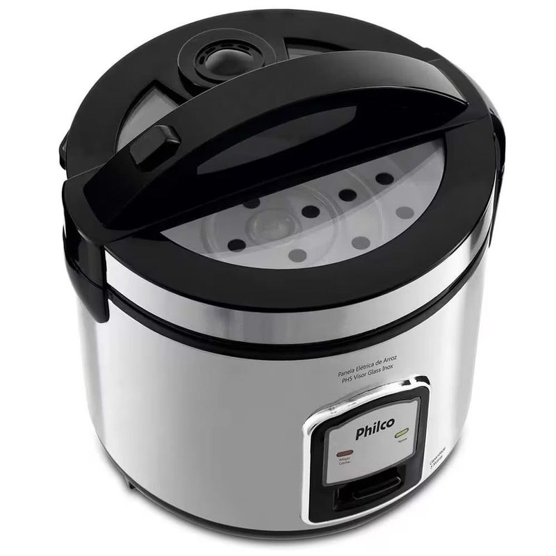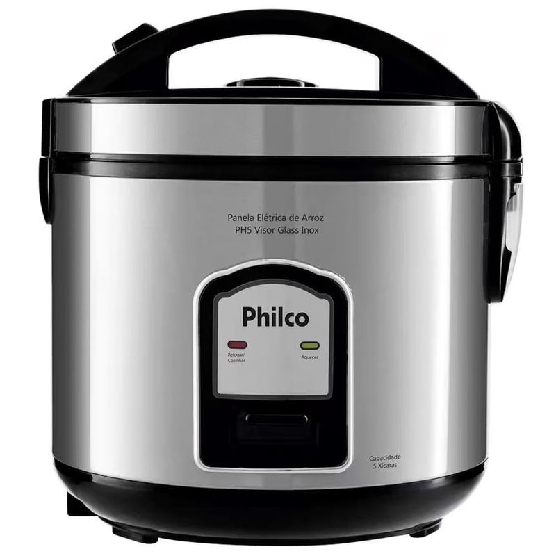 Tenha mais praticidade e facilidade ao preparar seus alimentos com a Panela Elétrica de Arroz Philco PH5 Visor Glass!Com uma capacidade para cozinhar até 5 xícaras de arroz, a Panela Elétrica de Arroz Philco PH5 Visor Glass, proporciona também praticidade na hora de refogar alimentos e até cozinhar legumes e verduras no vapor ao mesmo tempo em que cozinha o arroz, garantindo menos tempo no preparo das suas refeições.A Panela Elétrica de Arroz Philco PH5 Visor Glass vem acompanhada de bandeja perfurada que permite o cozimento de legumes e verduras no vapor e um copo medidor para o preparo das refeições na medida certa, além de coletor de água que evita o acúmulo de água na tampa da panela.Muito segura, possui um sistema de desligamento automático e podendo ativar a função manter aquecido, evitando que queime os alimentos, tampa vedada com alça, saída de vapor e botão de travamento, além de tigela antiaderente, que facilita a limpeza após o uso. O cordão de energia é removível, permitindo que você sirva os alimentos onde quiser.Mais praticidade no seu dia a dia com a Panela Elétrica de Arroz Philco PH5 Visor Glass!