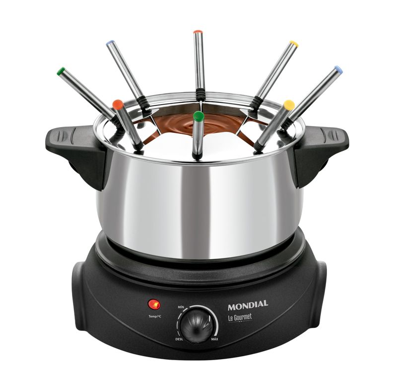 Pode chamar a família e os amigos porque o Fondue Elétrico Le Gourmet II Mondial possui alta capacidade e permite o preparo de até 2,4 litros das suas melhores receitas de fondue. O revestimento antiaderente facilita o uso e a limpeza. Além disso, são 1200W de potência que garante alta performance nos preparos. Saiba mais sobre o FD-02 da Mondial: PRATICIDADE NA COZINHA: O fondue elétrico da Mondial prepara fondues de queijo, carne, chocolate e muito mais. IDEAL PARA COMPARTILHAR: Acompanham 8 garfos com identificação colorida para juntar a família toda. REVESTIMENTO ANTIADERENTE: A panela aquece rapidamente, evita que os alimentos grudem e facilita a limpeza. ALTA CAPACIDADE: Possui capacidade total de 3 litros, permitindo o preparo de 2,4 litros de fondue com tranquilidade. POTÊNCIA DE 1200W: Garante precisão e eficiência na hora do preparo, além de manter o calor constante. CONTROLE DE TEMPERATURA: Diferentes temperaturas para você escolher a ideal para cada tipo de receita e garantir os melhores resultados. DESIGN EM INOX: Garante beleza e mais durabilidade ao produto. LÂMPADA PILOTO: A luz vermelha indica o funcionamento do produto. UM ANO DE GARANTIA MONDIAL: A Mondial é a escolha de milhões de consumidores. Mondial, a escolha inteligente!
