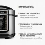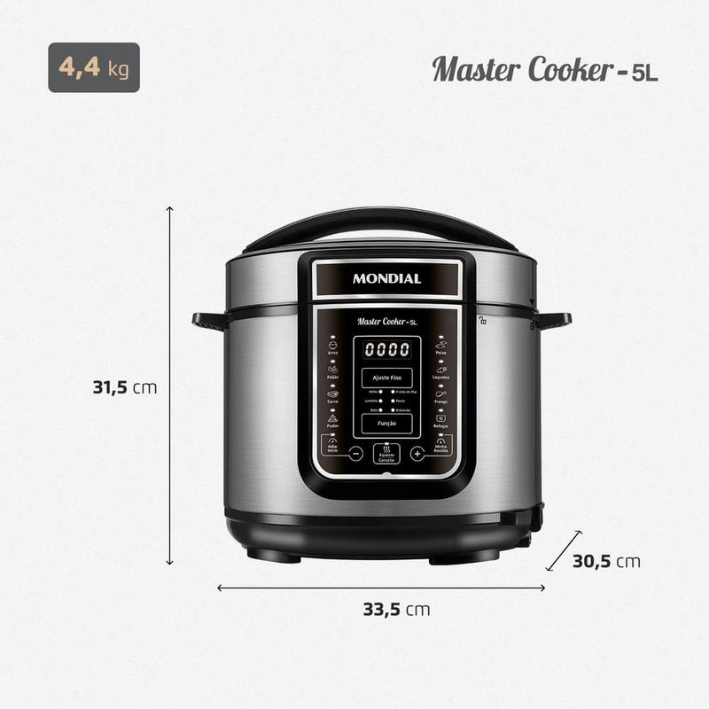 Transforme o ato de cozinhar em algo prático e prazeroso com receitas deliciosas, sem esforços e sujeiras, com a Panela Elétrica de Pressão Mondial Digital Master Cooker PE-38. Muito fácil de mexer, ela possui design moderno e painel digital intuitivo, com 14 opções de pré-programadas.Faça refeições completas com a Panela Elétrica de Pressão Mondial , entre receitas do dia a dia , como arroz, feijão, carne e muito mais como, pudim, frutos do mar e frango. Com capacidade total para até 5 litros, é possível fazer receitas para toda a família e ainda conservar as propriedades dos alimentos. O recipiente de cozimento é removível e muito fácil de limpar. Sua cozinha fica mais dinâmica, pois você coloca os ingredientes de suas receitas dentro da panela, obedece o tempo e a forma de preparo e fica livre para realizar outros tipos de atividades. Segura e fácil de manusear, acompanha válvula de segurança, coletor de vapor e tampa com alça, itens que facilitam o preparo de sua receita. A sua cozinha ganha em estilo e você em praticidade, segurança e tecnologia para fazer suas receitas preferidas ao toque de um botão.