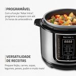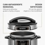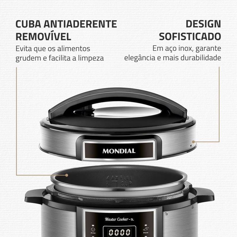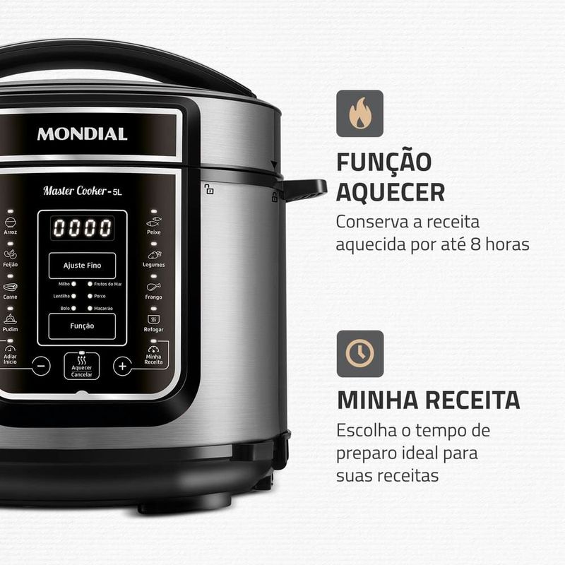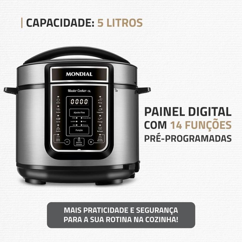 Transforme o ato de cozinhar em algo prático e prazeroso com receitas deliciosas, sem esforços e sujeiras, com a Panela Elétrica de Pressão Mondial Digital Master Cooker PE-38. Muito fácil de mexer, ela possui design moderno e painel digital intuitivo, com 14 opções de pré-programadas.Faça refeições completas com a Panela Elétrica de Pressão Mondial , entre receitas do dia a dia , como arroz, feijão, carne e muito mais como, pudim, frutos do mar e frango. Com capacidade total para até 5 litros, é possível fazer receitas para toda a família e ainda conservar as propriedades dos alimentos. O recipiente de cozimento é removível e muito fácil de limpar. Sua cozinha fica mais dinâmica, pois você coloca os ingredientes de suas receitas dentro da panela, obedece o tempo e a forma de preparo e fica livre para realizar outros tipos de atividades. Segura e fácil de manusear, acompanha válvula de segurança, coletor de vapor e tampa com alça, itens que facilitam o preparo de sua receita. A sua cozinha ganha em estilo e você em praticidade, segurança e tecnologia para fazer suas receitas preferidas ao toque de um botão.
