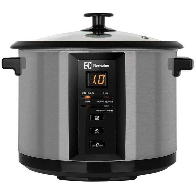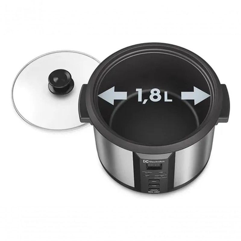 Panela Elétrica Electrolux Por Rita Lobo 1,8L Preta Experience Digital (ECC20) 110VPRODUTO COM EMBALAGEM26 cmAltura28 cmLargura28 cmProfundidade3,1PesoPRODUTO SEM EMBALAGEM24,3 cmAltura33,2 cmLargura24,8 cmProfundidade2,8 kgPesoResumoA Panela Elétrica Chef (ECC20) da Electrolux utiliza-se de toda a sua praticidade para ajudar você a preparar pratos deliciosos. A ECC20 possui painel LED programável Pro-Select, assim você programa quando a sua receita ficará pronta. Ainda possui diversas funções e detalhes que a deixam ainda mais essencial para o seu dia a dia. Faça pratos repletos de sabor com esta multifuncional panela elétrica. Confira todos os Eletroportáteis da funções para diversos pratosA sua panela elétrica possui as seguintes funções:- Rápido: para receitas com temperaturas mais altas, como arroz, refogados, legumes e sobremesas;- Lento: cozinha em modo brando, perfeita para molhos e ensopados;- Sopa;- Manter Aquecido: que mantém o prato quente após o preparo;- Desligamento Automático: ela se desliga quando o preparo está pronto e entra no modo Manter Aquecido.Alta capacidade para todas as receitasA ECC20 possui 1,8l, ou 10 xícaras de capacidade, assim você pode preparar diversas receitas sem preocupações com o seu tamanho.Detalhes que deixam tudo melhorSua panela Electrolux ainda conta com tampa de vidro temperado, exterior em aço inoxidável escovado, suporte para cozimento a vapor, recipiente interno removível antiaderente e cabo elétrico removível.EspecificaçõesCapacidade em litrosDe 1,4L a 1,8LCapacidade de xícarasDe 8 a 10 XícarasDesligamento automáticoSimPainel digitalSimSuporte de cozimento à vaporSimTampa de vidroSimTampaAbertaCabo de energia removívelSimPotência630 WTimerSimCorPreto / InoxFunção manter aquecidoSimTipo de painelDigitalEspecificações técnicasModeloECC20Frequência60 HzAltura do produto24,3 cmLargura do produto