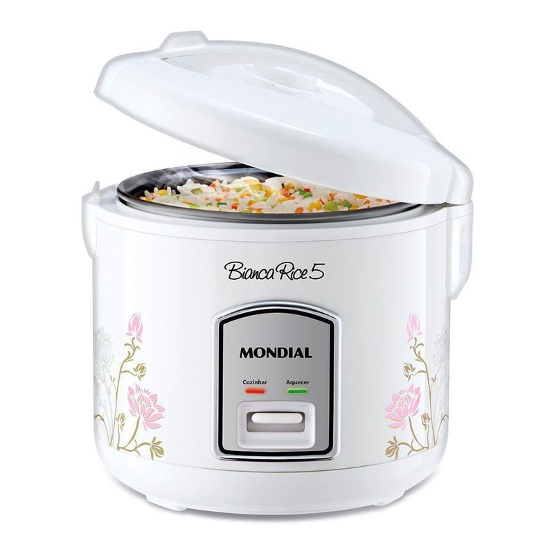 Panela Elétrica Mondial Npe-05-5x Panela Elétrica-220v-brancoPanela de Arroz Bianca Rice 5 NPE-05-5X: esta panela de arroz elétrica branca é antiaderente, tem 400W, vem com livro de receitas e faz até 5 xícaras de arroz além de outros doces e salgados como risotos, sopas, carnes e legumes. Quer saber o que vem na panela de arroz? Esta panela elétrica acompanha um cesto cozi-vapor para cozinhar legumes e verduras no vapor, o que preserva vitaminas e deixa mais saudável. Ela também vem com 1 colher especial, 1 copo medidor e 1 livro de receitas para você cozinhar o que quiser de A a Z. Sua válvula de saída de vapor libera o excesso de vapor durante o preparo, proporcionando cozimento perfeito. Além disso, o coletor de vapor recolhe a água acumulada durante o funcionamento, para você não se molhar ao levantar a tampa. A cuba (recipiente) tem revestimento antiaderente: os alimentos não grudam e a faz mais prática de lavar. Seus 400W de potência ajudam você a cozinhar mais rápido. Uso doméstico.Modelo - NPE-05-5XCor - BrancoVoltagem (Tensão) - 127V/220VItens inclusos - 01 Panela Elétrica - Manual de InstruçõesTipo de panela - Panela Elétrica de ArrozMaterial - PPCapacidade - 5 xícarasPotência - 400WRevestimento interno - SimAção do produto - Cozinhar, refogar e praparar alimentos de forma mais rápida.Luz indicadora - SimAcessório para cozimento a vapor - SimColher e copo medidor - SimAlimentação - Energia ElétricaDimensões do produto - 21cm x 21cm x 24cm (AxLxP)Peso do produto - 1,400kgComprimento do cabo - 1,50mGarantia - 1 ano