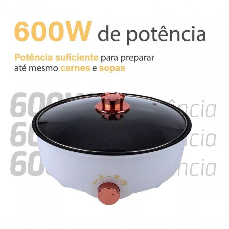 Panela Elétrica Multifuncional Antiaderente Tampa De VidroTorne Sua Cozinha Mais Prática com a Panela Elétrica Multiuso – Rapidez, Eficiência e Facilidade em um só produto.- Antiaderente para Limpeza Sem Esforço: Esqueça as panelas difíceis de lavar! O revestimento antiaderente de alta qualidade faz com que a comida não grude, facilitando a limpeza após o uso. Mais praticidade e menos trabalho na sua rotina.- Design Compacto e Funcional: Com um diâmetro interno de 26 cm e design elegante, a Panela Elétrica Multiuso se encaixa perfeitamente na sua cozinha, sem ocupar muito espaço. Compacta, mas com grande capacidade, é ideal tanto para pequenas porções quanto para refeições completas.- Alta Qualidade e Durabilidade: Feita de material grau alimentício PP, essa panela garante alimentar, sendo resistente e durável para o uso diário. Cozinhar nunca foi tão e eficiente! Características:- Tamanho de 26cm com tampa de vidro- Potência de 600W- Voltagem: 110V