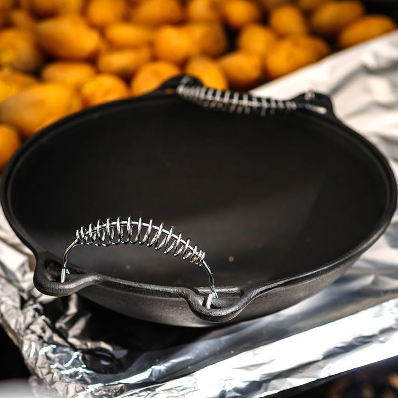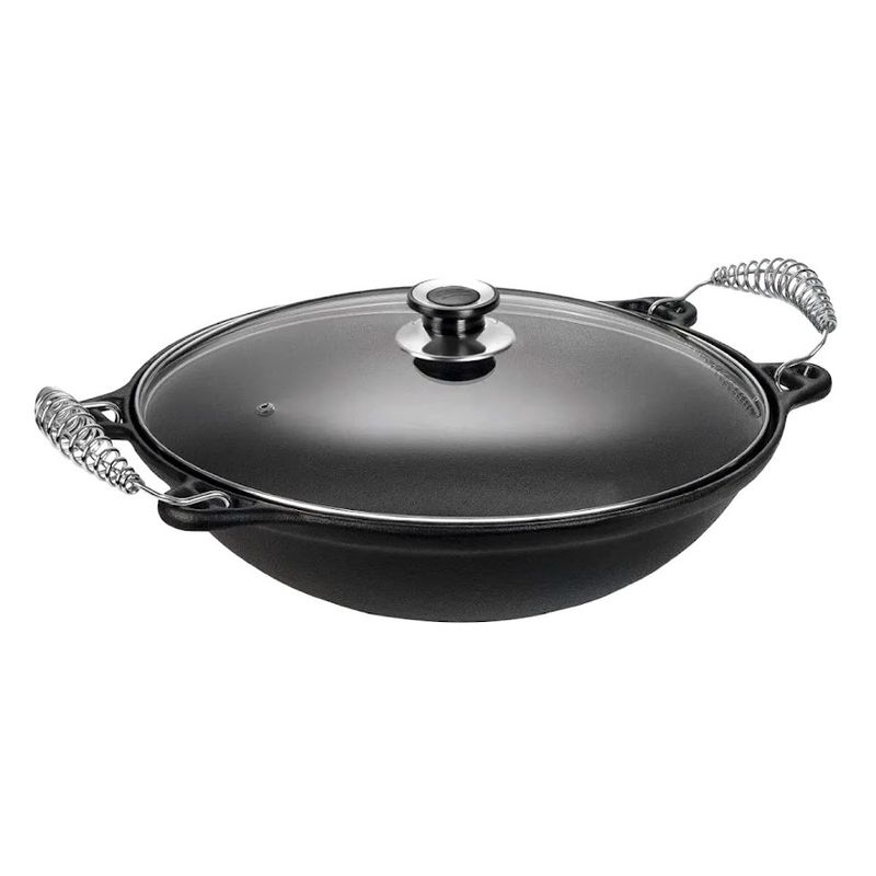 Panela Mineira Wok em Ferro Alça Espiral Tampa Vidro 36cm 6L A Panela Wok Alça Espiral Tampa de Vidro da Panela Mineira possui um design autêntico, com o interior abaulado e bordas arredondadas que evitam que o alimento transborde da panela. Ideal para preparar peixes, carnes, feijoadas, frutos do mar, legumes e outros pratos, de maneira prática e eficiente. Sua excelente distribuição e retenção de calor, característico do ferro fundido, mantém os alimentos aquecidos por muito mais tempo, além de enaltecer seus sabores e aromas. Onde Usar: Pode ser utilizado em fogões a gás, a lenha, elétricos, cooktops de indução, vitro-cerâmicos, fornos, grills, churrasqueiras e fogo de chão. Orientação de Uso e Conservação:Antes do primeiro uso: Lave com água e sabão, seque bem com um pano e leve ao fogo para remover toda a umidade. Já vem pronta para uso, então não precisa ser curada. Guarde em um local seco. Após cada uso: Lave com água e sabão, usando uma esponja ou escova para remover todos os resíduos de alimentos. Se restarem resíduos, ferva água com um pouco de detergente para soltá-los. Pintura: Revestimento atóxico que garante durabilidade e proteção prolongada, sem causar nenhum dano à saúde. Características Técnicas e Medidas Panela:Altura Com Tampa: 19cm.Altura Sem Tampa: 12cm.Material: Ferro Fundido.Diâmetro: 36cm.Linha: Artesanal.Litragem: 6L.Alça: Espiral.Peso: 5Kg. Itens Inclusos:01 Panela Wok Artesanal Alça Espiral Panela Mineira 36x19cm 6L.01 Tampa de Vidro Temperado Panela Mineira 36cm.01 Batoque em Platinela. Código: 878PM ProdutoLojaPlast.