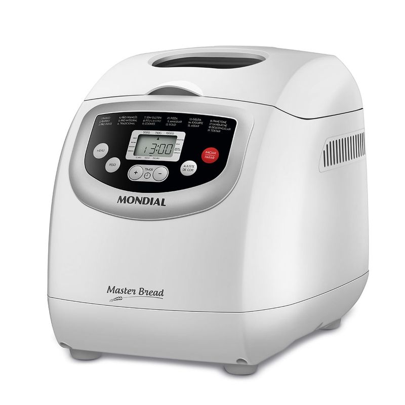 A Panificadora Automática Master Bread Mondial prepara diversos tipos de pães, bolos, pizzas, panetones, além de fazer geleia, iogurte, tostar castanhas e muito mais. O painel digital te possibilita iniciar os preparos com apenas 1 clique e possui 19 opções pré-programadas. Conta com ajuste de tonalidade e de peso, função timer para programar seu tempo e potência de 700W. Saiba mais sobre a NPF-54 da Mondial: 19 FUNÇÕES PRÉ-PROGRAMADAS: Prepare receitas com apenas um clique! São 19 funções programadas para o preparo de diversos tipos de pães, bolos, massas e muito mais. PAINEL DIGITAL: Facilita a escolha do tamanho dos pães, ciclos e timer para a produção. VERSATILIDADE DE RECEITAS: A panificadora automática Mondial prepara pães, bolos, pizzas, panetones, iogurtes, geleias e muito mais. AJUSTE DE TONALIDADE: Possibilita escolher o tom do pão que preferir: claro, médio ou escuro. FUNÇÃO TIMER: Permite programar os preparos com até 15 horas de antecedência. POTÊNCIA DE 700W: Ótimo desempenho e mais agilidade nas receitas. VISOR DE ACRÍLICO: Garante mais praticidade para visualizar e acompanhar o preparo das receitas. SELETOR DE PESO: Selecione entre pequeno (500g), médio (750g) e grande (1kg). FORMA REMOVÍVEL: Com revestimento antiaderente, facilita a retirada dos alimentos e a hora da limpeza. ACESSÓRIOS: Acompanha copo medidor e colher dosadora para facilitar o preparo. UM ANO DE GARANTIA MONDIAL: A Mondial é a escolha de milhões de consumidores. Mondial, a escolha inteligente!