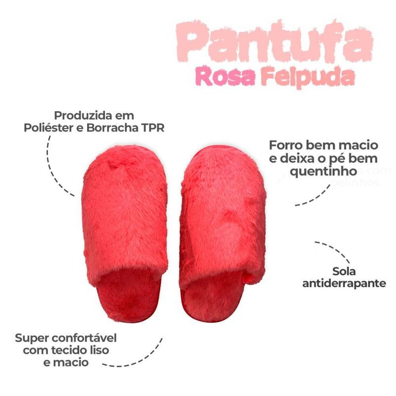 Pantufa Adulto Pink 40/41 Super Fofinha Felpuda e Macia ============================================================ Contém: 01 Par (02 Unidades) Especificações: - Material: Poliéster e Borracha - Tamanho: 40/41 - Cor Pink - Felpuda: Sim Cuidados com o Produto: - Lavagem a mão - Não usar alvejante - Não passar ferro - Limpeza a seco - Não pisar em ambientes molhados - Manter longe dos pets ============================================================ Devido à diferença entre monitores e iluminação diferentes, pode haver variação na tonalidade apresentada no anúncio. Medidas muito aproximadas.