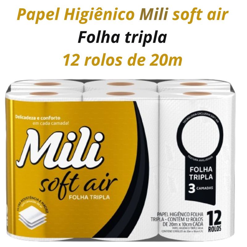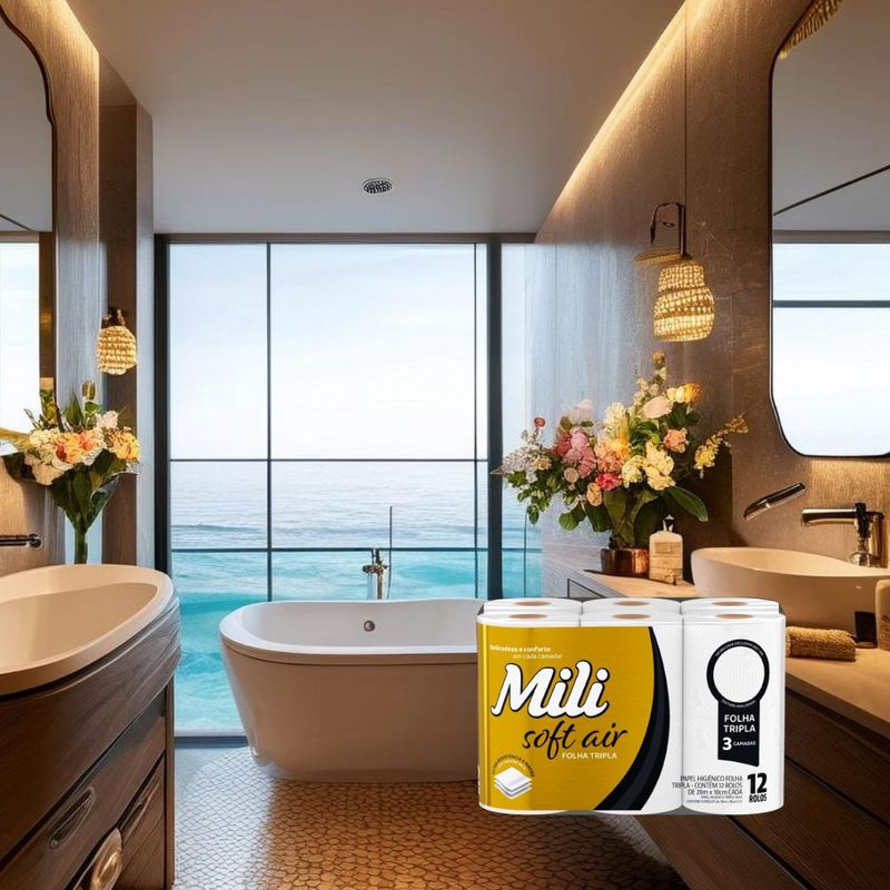 Papel Higiênico Folha Tripla - 12 rolos de 20m x10cm - Mili Soft Air Conforto e Qualidade para o Seu Dia a Dia! Transforme seus momentos de cuidado pessoal com o Mili Soft Air, o papel higiênico folha tripla que combina tecnologia exclusiva e textura aveludada para oferecer uma experiência única. Marca: Mili Fardo com 12 rolos: Cada rolo com 20m x 10cm Folha Tripla: Ultra resistência e maciez, com a inovação das camadas de ar. Toque Suave: Textura aveludada que proporciona conforto sem abrir mão da qualidade. Composição: 100% celulose Folha tripla, picotado de grofado Garanta já o seu!