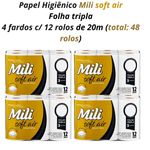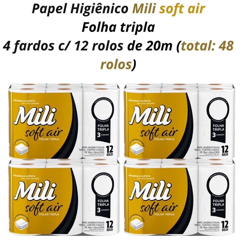 Papel Higiênico Folha Tripla Quantidade: 4 fardos c/ 12 rolos de 20m x10cm (total 48 rolos) - Mili Soft Air Conforto e Qualidade para o Seu Dia a Dia! Transforme seus momentos de cuidado pessoal com o Mili Soft Air, o papel higiênico folha tripla que combina tecnologia exclusiva e textura aveludada para oferecer uma experiência única. Marca: Mili Fardo com 12 rolos: Cada rolo com 20m x 10cm Folha Tripla: Ultra resistência e maciez, com a inovação das camadas de ar. Toque Suave: Textura aveludada que proporciona conforto sem abrir mão da qualidade. Composição: 100% celulose Folha tripla, picotado de grofado Garanta já o seu!