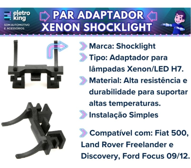 Par Adaptador Xenon/Led H7 compatível com Fiat 500, Land Rover Freelander e Discovery, Ford Focus 09/12 - SLL-14-H7 Estes adaptadores Shocklight são essenciais para a instalação correta das lâmpadas de LED/xênon, modelo H7, no seu carro. Eles evitam que seja necessária fazer qualquer adaptação irregular no encaixe das lâmpadas LED/Xênon, pois substituem as peças que são usadas para fixar as lâmpadas halógenas H7 originais de fábrica. Faça uma instalação com rapidez e sem danificar a tomada original! Especificações Técnicas: • Marca: Shocklight • Tipo: Adaptador para lâmpadas Xenon/LED H7 • Cód. Referência: SLL-14-H7 • Material: Alta resistência e durabilidade para suportar altas temperaturas. • Instalação: Simples, sem necessidade de modificações no sistema original do veículo. • Uso: Facilita a instalação de lâmpadas Xenon ou LED, melhorando a eficiência luminosa dos faróis. • Compatível com: Fiat 500/ Land Rover Freelander e Discovery / Ford Focus 09/12. ATENÇÃO! Antes de efetuar a compra verifique se o adaptador do anúncio servirá no seu carro, pois cada veículo possui um modelo de adaptador H7 diferente. Conteúdo da Embalagem: • 01 par de adaptador para Led/Xênon Importante: • Garantia de 90 Dias. • Valor do Par.