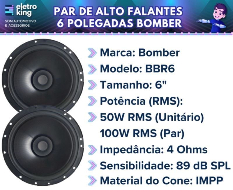 Par de Alto Falantes 6" Bomber Original Montadoras - 100 Watts RMS Eleve a qualidade do som do seu veículo com este Par de Alto Falantes 6" Bomber Original Montadoras. Com 100 Watts RMS de potência, esses alto-falantes proporcionam um áudio nítido e envolvente para sua experiência musical. Projetados com precisão para atender aos padrões das montadoras, esses alto-falantes garantem um ajuste perfeito no seu veículo, oferecendo uma atualização de áudio sem complicações. A qualidade sonora é aprimorada, permitindo que você desfrute de músicas com clareza e fidelidade. Além disso, esses alto-falantes 6" da Bomber são duráveis e confiáveis, garantindo um desempenho consistente ao longo do tempo. Transforme seu sistema de áudio automotivo com este Par de Alto Falantes Bomber, proporcionando uma experiência auditiva de alta qualidade em cada viagem. Especificações Técnicas: • Modelo: BBR6 • Tamanho: 6" • Potência (RMS): 50 W RMS (unitário) • Impedância: 4 Ohms • Sensibilidade: 89 dB SPL • Material do Cone: IMPP Conteúdo da Embalagem: • 01 PAR de Alto-Falante BBR (DUAS UNIDADES) • Manual e Certificado de Garantia Importante: • Garantia de 90 dias. • Valor Par.