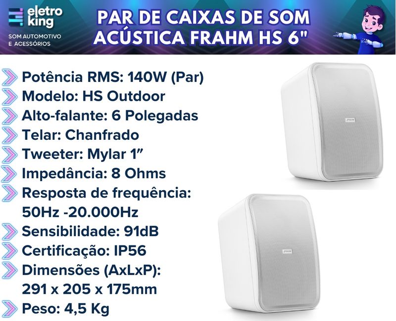 Par de Caixas de Som Acústica Frahm HS 6" Outdoor Passiva Branca - 140 Watts Rms 8 Ohms Par de Caixas de Som Acústicas Frahm HS 6", com design elegante, ideais para ambientes externos. Cada caixa oferece 70 Watts RMS de potência e opera em 8 Ohms, proporcionando alta qualidade de som e durabilidade em condições climáticas variadas. São preparadas para reproduzir toda faixa de frequência acústica com o mínimo de oscilação, ou seja, todo som emitido é recebido com a mesma intensidade e qualidade, sem variações entre o som de uma voz ou de um instrumento, por exemplo. Perfeitas para sonorização de áreas externas, como varandas, jardins e espaços de lazer. Especificações Técnicas: • Potência RMS: 140W ( Par ) • Modelo: HS Outdoor • Alto-falante: 6 Polegadas • Telar: Chanfrado • Tweeter: Mylar 1" • Impedância: 8 Ohms • Resposta de frequência: 50Hz - 20.000Hz • Sensibilidade: 91dB • Certificação: IP56 • Material: Plástico ABS resistente às intempéries. • Dimensões ( A x L x P ) : 291 x 205 x 175mm • Peso: 4,5 Kg Conteúdo da Embalagem: • 02 Caixas Frahm • 04 Knobs plásticos • 02 Suportes metálicos • 04 Parafusos 3,5 x 16mm • 02 Suportes plásticos da caixa • 02 Suportes plásticos de parede • 01 Manual de instruções Importante: • Garantia de 273 Dias. • Valor do Par.