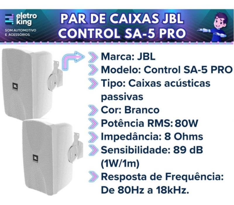 Par de Caixas JBL Control SA-5 PRO Passiva Branca - 80 Watts RMS As caixas JBL Control SA-5 PRO são ideais para quem procura qualidade sonora superior em ambientes profissionais. Com potência de 80 Watts RMS, elas proporcionam um som claro e potente. Seu design compacto e elegante se integrem facilmente a qualquer decoração. Além disso, estas caixas são passivas, o que significa que precisam ser conectadas a um amplificador externo para funcionar. São perfeitas para uso em bares, restaurantes, salas de conferências e outros espaços que necessitam de um áudio de alta qualidade. Especificações Técnicas: • Marca: JBL • Modelo: Control SA-5 PRO • Tipo: Caixas acústicas passivas • Cor: Branco • Potência RMS: 80 Watts • Impedância: 8 Ohms • Sensibilidade: 89 dB (1W/1m) • Resposta de Frequência: De 80Hz a 18kHz. • Peso: O peso líquido de cada caixa é de 1,52 kg. • Conexão: Utiliza borne de pressão. • Uso: Interno e externo (resistente às intempéries) • Aplicações: Ideal para instalações comerciais, bares, restaurantes, lojas e ambientes corporativos. Conteúdo da Embalagem: • 01 Par de Caixas JBL Control SA-5 PRO • Manual e Certificado de Garantia Importante: • Garantia de 273 Dias. • Valor do Par.