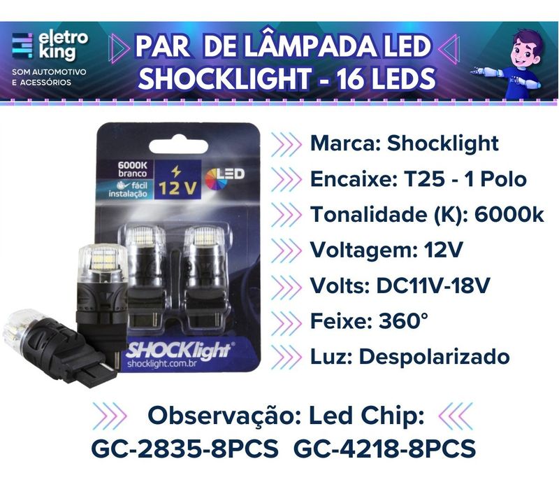 Par Lâmpada Led T25 1 Polo 3156 16 Leds Shocklight - SLL-123156-BC É uma lâmpada LED de substituição projetada para várias aplicações automotivas, como luzes de freio, luzes de ré, luzes de piscas e luzes de neblina, entre outras. Com 16 LEDs, oferece uma iluminação brilhante e de baixo consumo de energia. Compatível com sistemas de 12V, possui uma base de encaixe tipo 3156 de um polo. A marca Shocklight é conhecida por produzir produtos de alta qualidade para iluminação automotiva. Especificações Técnicas: • Marca: Shocklight • Encaixe: T25 - 1 Polo • Tonalidade (K): 6000k • Voltagem: 12V • Volts: DC11V-18V • Feixe: 360° • Uso: Luzes de freio, luzes de ré, luzes de piscas, luzes de neblina. • Luz: Despolarizado • Input (A) 13.5V: 0.5A±0.06A • Observação: Led Chip: GC-2835-8PCS - GC-4218-8PCS Conteúdo da Embalagem: • 02 Lâmpadas Led 1 Polo Importante: • Garantia de 90 Dias. • Valor do Par.
