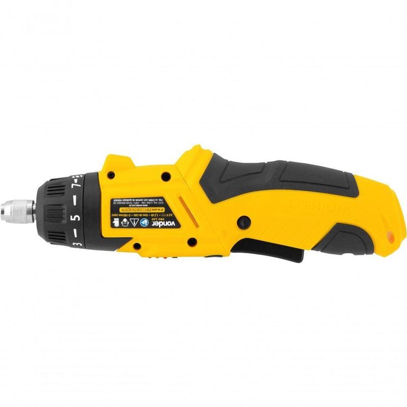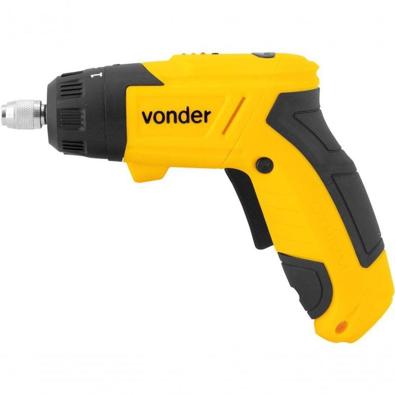Parafusadeira Bateria 3,6v Kit Com 12pcs VonderMarca: VonderConteúdo da embalagem:1 Parafusadeira. Acompanha: 1 fonte bivolt automático, 11 bits, sendo 3 fendas (4 mm, 5 mm, 6 mm), 3 phillips (PH1, PH2, PH3), 3 pozidrive (PZ1, PZ2, PZ3), 2 allen (2 mm, 3 mm) e 1 soquete magnético.Destaques e diferenciais:Possui regulagem para 7 posições de torque e 1 posição para perfuração. Permite realizar furos de até 3 mm em madeira e metal, com a broca apropriada (não acompanha). Possui cabo com revestimento emborrachado e ajuste para 2 posições, proporcionando conforto e praticidade ao operador, além de LED para melhor visibilidade do local de trabalho.Aplicações e dicas de uso:Indicada para fixar e soltar parafusos em geral. Uso hobby/doméstico.Detalhes TécnicosModelo: PBV 120 Tensão da bateria (V): 3,6 V Tipo de bateria: Lítio Tensão do carregador de bateria: 110V~ - 220 V~ - Bivolt automático Frequência (Hz): 50 Hz/60 Hz Tipo de mandril: Enc. sextavado - 1/4 - 6,35 mm Sistema de reversão: Sim Tipo de velocidade: Variável Rotação da furadeira/parafusadeira: 0 - 180/min Luz de LED: Sim Aceleração transmitida nas mãos - braços do operador - ah: 0,566 m/s² Incerteza da aceleração transmitida nas mãos - braços do operador - k: 1,5 m/s² Segue norma: ABNT NBR IEC 60745-1 e ABNT NBR IEC 60745-2-2Massa aproximada.: 420 gGarantia - E (CDC):Garantia legal: 90 dias + Garantia contratual: 3 meses Produto: Parafusadeira | Voltagem: Bivolt