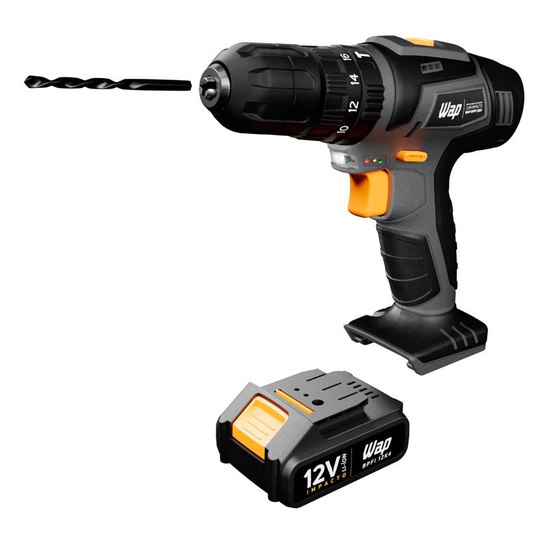 A Parafusadeira e Furadeira com Impacto BPFI 12K4 é a ferramenta ideal para quem busca qualidade e eficiência. Possui tanto o modo parafusadeira quanto modo furadeira com e sem impacto, oferecendo versatilidade na hora do uso. Possui seletor de Torque com 18 níveis na função parafusar, 1 função de perfurar e 1 função de impacto, com um toque máximo de 30 Nm. Possui bateria compacta e removível de Li-íon de 12V com 1500mAh, proporcionando mais desempenho e facilidade em seu trabalho. Conta com Led de iluminação para melhorar a visibilidade do local de trabalho, além de um indicador de carga de bateria e uma pega emborrachada, proporcionando mais conforto durante utilização da ferramenta. Além disso, o usuário não precisa de outra ferramenta para fazer o aperto da broca ou do bit ao utilizar no produto, pois ela possui um Mandril de aperto rápido de 3/8” (10mm). Tudo isso contribui para que você tenha uma excelente experiência na hora de utilizá-la em diversas tarefas.Leve e robusta, a Parafusadeira e Furadeira com Impacto BPFI 12K4 apresenta dois níveis de velocidade, sendo: 0 – 400 RPM / e 0 – 1500 RPM e dois níveis de batidas por minuto na função impacto, sendo a primeira: 0 - 6000 BPM / e a segunda: 0 – 22000 BPM. Ainda acompanha maleta completa com acessórios para facilitar o uso com a ferramenta.DADOS TÉCNICOS:TENSÃO: 12 VDCCAPACIDADE DA BATERIA: 1500 mAhFREQUÊNCIA: 50/60 HzTIPO DA BATERIA: Li-IonTEMPO DE CARREGAMENTO: 3-5 horasMANDRIL: 3/8" - 10 mmTORQUE: 30 Nm (3,0 kgf.m)NÚMERO DE IMPACTOS: Velocidade 1: 0 - 6000 | Velocidade 2: 0 - 22000ROTAÇÕES: Velocidade 1: 0 - 400 | Velocidade 2: 0 - 1500PERFURAÇÃO NA MADEIRA: Ø35 mmPERFURAÇÃO NO AÇO: Ø10 mmPERFURAÇÃO NO CONCRETO: Ø12 mmCOR: Cinza, Amarelo e PretoCLASSE DE ISOLAÇÃO: Classe IICUBAGEM: 0,0032 m ³PESO LÍQUIDO 1,1 KgPESO BRUTO: 1,8 KgDIMENSÕES DO PRODUTO (CxLxA): 22 x 6,5 x 20 cmDIMENSÕES DA EMBALAGEM (CxLxA): 20 x 7 x 23 cmGARANTIA PRODUTO: 01 ANO (3 meses de garantia legal e mais 9 meses de garantia especial concedida pelo fabricante).BATERIA: 6 MESESCONTEÚDO DA EMBALAGEM: Parafusadeira e Furadeira WAP BPFI 12K4 + Acessórios + Manual de Instruções.