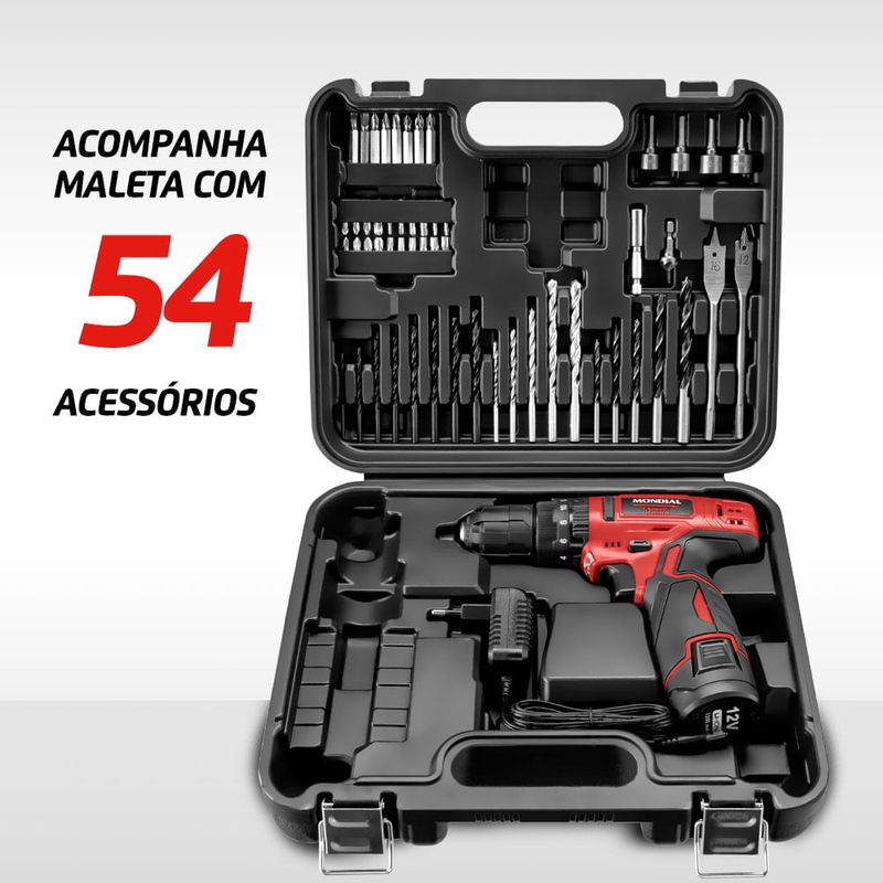 A Parafusadeira e Furadeira Mondial Power Tools é a escolha ideal para quem busca eficiência e praticidade ao furar e parafusar. Sem fio, ela oferece maior mobilidade e, com carregamento Bivolt, pode ser utilizada em qualquer lugar, sem preocupações com a voltagem. Com rotação variável e reversível, além de controle de torque com 16 posições, essa ferramenta garante precisão em todas as operações. Acompanha uma maleta com 54 acessórios essenciais, incluindo bits, brocas, soquetes e prolongador. Descubra mais sobre a PI-11MA da Mondial: CONTROLE DE TORQUE: São 16 posições diferentes para furar e parafusar sem passar da medida. Para maior eficiência, ajuste as posições de torque de acordo com o material a ser parafusado ou perfurado. VELOCIDADE VARIÁVEL E REVERSÍVEL: Obtenha maior precisão em todas as operações, com ajustes de velocidade que variam de 0 a 350 RPM ou de 0 a 1.250 RPM. BATERIA RECARREGÁVEL: Sem fio e portátil de verdade! A Parafusadeira e Furadeira possui bateria recarregável de 12V que garante alta durabilidade e maior autonomia em trabalhos mais longos. FUNÇÃO IMPACTO: Essencial na furadeira, esta função aplica uma força extra, permitindo perfurações rápidas e eficientes em alvenaria e até mesmo em concreto. BIVOLT: A ferramenta pode ser recarregada tanto em tomadas de 127V, quanto em 220V. Tenha a liberdade de realizar seus projetos em qualquer lugar, independente da voltagem! MANDRIL PARA MAIOR PRECISÃO: A furadeira tem mandril no padrão de 10 mm (3/8") para que a broca fique bem presa e centrada durante a operação, proporcionando precisão e segurança ao furar. LANTERNA LED: Uma forte aliada até no escuro! A ferramenta possui lanterna Led e permite realizar projetos até em locais com pouca luminosidade. ACOMPANHA MALETA: Fácil de armazenar e transportar, a maleta contém 54 acessórios essenciais para furar e parafusar, incluindo 20 bits, 20 brocas para aço, concreto e madeira, 8 bits longos, 4 soquetes, 1 prolongador e 1 broca alargadora. UM ANO DE GARANTIA MONDIAL: A Mondial é a escolha de milhões de consumidores. Mondial, a escolha inteligente!