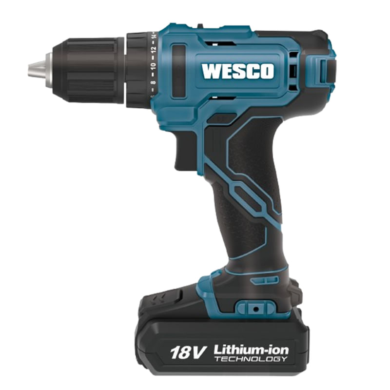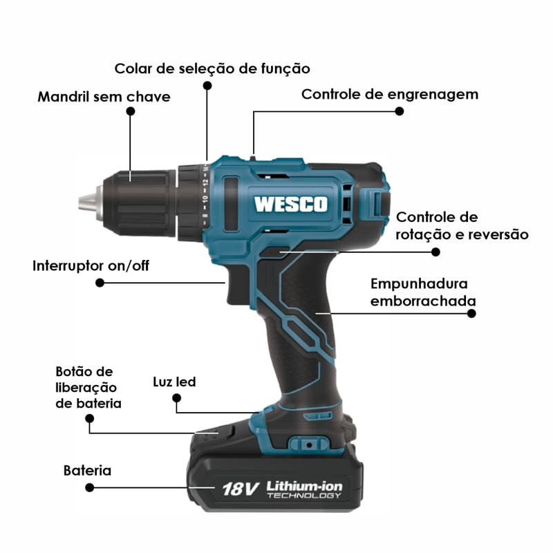 PARAFUSADEIRA E FURADEIRA DE IMPACTO COM 18V MODELO WS2390 - 13 MM + KIT COM 18 PEÇAS MTX Este é o lançamento da Wesco, a parafusadeira WS2390, com 18V e com 20+3 posições de torque Diferenciais da WS2890.9 Possui Mandril com aperto rápido; Com Velocidade variável e reversível; Conta com 2 velocidades; Para maior segurança, possui Freio de motor 20+3 posições de torque; E conta com Luz LED para clarear o local de trabalho. Dados técnicos: Tensão: 18V; Velocidade: 0-400/0-1600 /min Taxa de impacto: 0-6800 bpm / 0-27200 bpm; Número de posições da embreagem: 20+3; Torque máx.: 50 N.m; Capacidade do mandril: 13mm; Capacidade de perfuração máx: Aço: 13mm, Madeira: 35mm, Concreto: 13mm; Peso da máquina: 1kg; Entrada do carregador: 100-240V ~ 50/60Hz; Saída do carregador: 20V 2.0A; Capacidade da bateria: 2,0Ah; Tempo de carregamento: 1 hr. Itens que acompanham a máquina: -01 Bateria 18v com 2,0Ah; -01 Carregador; -01 Clipe de cinto; -01 Kit de Bits com 18 peças MTX.