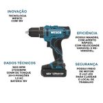 PARAFUSADEIRA E FURADEIRA DE IMPACTO COM 18V MODELO WS2390 - 13 MM + KIT COM 37 PEÇAS Este é o lançamento da Wesco, a parafusadeira WS2390, com 18V e com 20+3 posições de torque Diferenciais da WS2890.9 Possui Mandril com aperto rápido; Com Velocidade variável e reversível; Conta com 2 velocidades; Para maior segurança, possui Freio de motor 20+3 posições de torque; E conta com Luz LED para clarear o local de trabalho. Dados técnicos: Tensão: 18V; Velocidade: 0-400/0-1600 /min Taxa de impacto: 0-6800 bpm / 0-27200 bpm; Número de posições da embreagem: 20+3; Torque máx.: 50 N.m; Capacidade do mandril: 13mm; Capacidade de perfuração máx: Aço: 13mm, Madeira: 35mm, Concreto: 13mm; Peso da máquina: 1kg; Entrada do carregador: 100-240V ~ 50/60Hz; Saída do carregador: 20V 2.0A; Capacidade da bateria: 2,0Ah; Tempo de carregamento: 1 hr. Itens que acompanham a máquina: -01 Bateria 18v com 2,0Ah; -01 Carregador; -01 Clipe de cinto; -01 1 Conjunto de Bits 37 peças Noll Descrição do Produto:- 24 Peças 25mm CR-V Bits:• Fenda: 4, 4.5, 5.5, 6, 6.5, 8mm.• Philips: PH1, PH2, PH3.• Pozidriv: PZ1, PZ2, PZ3.• Allen Hexagonal: 3, 4.5, 5.5, 6mm.• Allen Torx: T10, T15, T20, T25, T27, T30, T40.- 08 Peças 50mm CR-V Bits:• Fenda: 5.5, 8mm.• Philips: PH1, PH2, PH3.• Pozidriv: PZ1, PZ2, PZ3. - 04 Peças 38mm Chave Para Porca:• 5, 6, 8, 10mm. - 01 Adaptador Magnético.Referência: 372,0006.